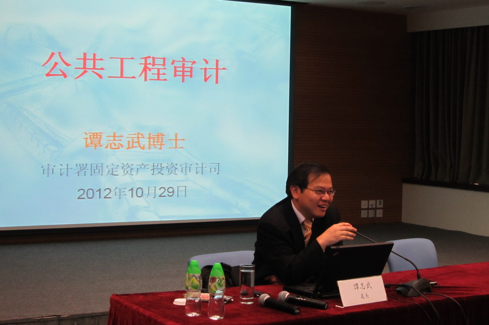 “公共工程審計”在上月底舉行,由國家審計署投資司譚志武處長講授,詳細講述公共工程的概念、特點和管理程序,介紹中國政府投資審計現狀及發展趨勢,同時結合實例講解工程質量管理審計及工程投資控制審計的審計重點和審計方法。
