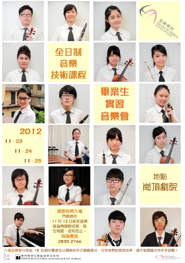 全日制音樂技術課程《畢業生實習音樂會》將於十一月二十三至二十五日在崗頂劇院連演三天,憑票免費入場,門票現於澳門演藝學院音樂學校(和隆街三十五號,望德堂斜對面)派發,數量有限,派完即止。查詢可於辦公時間致電二八三五二七六六。