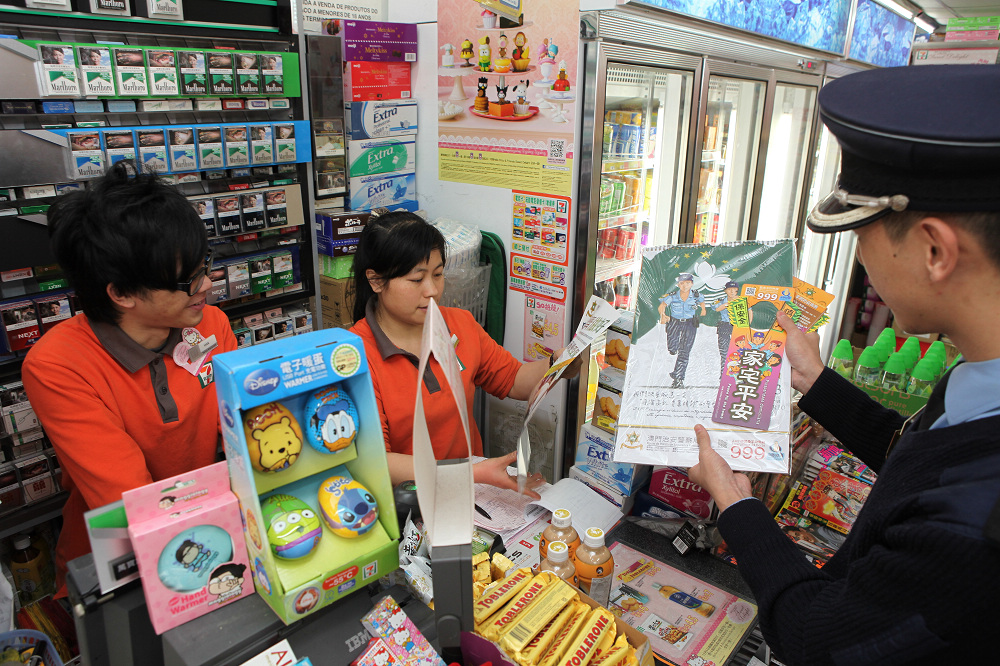 農曆新年即將到來,為配合各項相應的冬防治安工作,同時考慮到歲晚期間盜竊及騙案較為猖獗,而主因往往由於自身防範意識薄弱,故此,本局近期頻繁到本澳及離島警區加強大廈防罪、店鋪防盜騙等宣傳活動。而即將就職的準警官們學以致用,透過實地的參與發揮治安警察局服務市民的精神,連續兩天冒著寒冷到皇朝、南灣、殷皇子、關閘、黑沙環、水坑尾以及新橋義字街一帶,向不下百間的商鋪大廈、超市零售、餐廳食肆等派發新年掛曆,並沿途向市民旅客派發 “慎門戶 保安全”、 “提防小手”、 “慎防受騙”等主題的單張海報以及防罪 “揮春”。