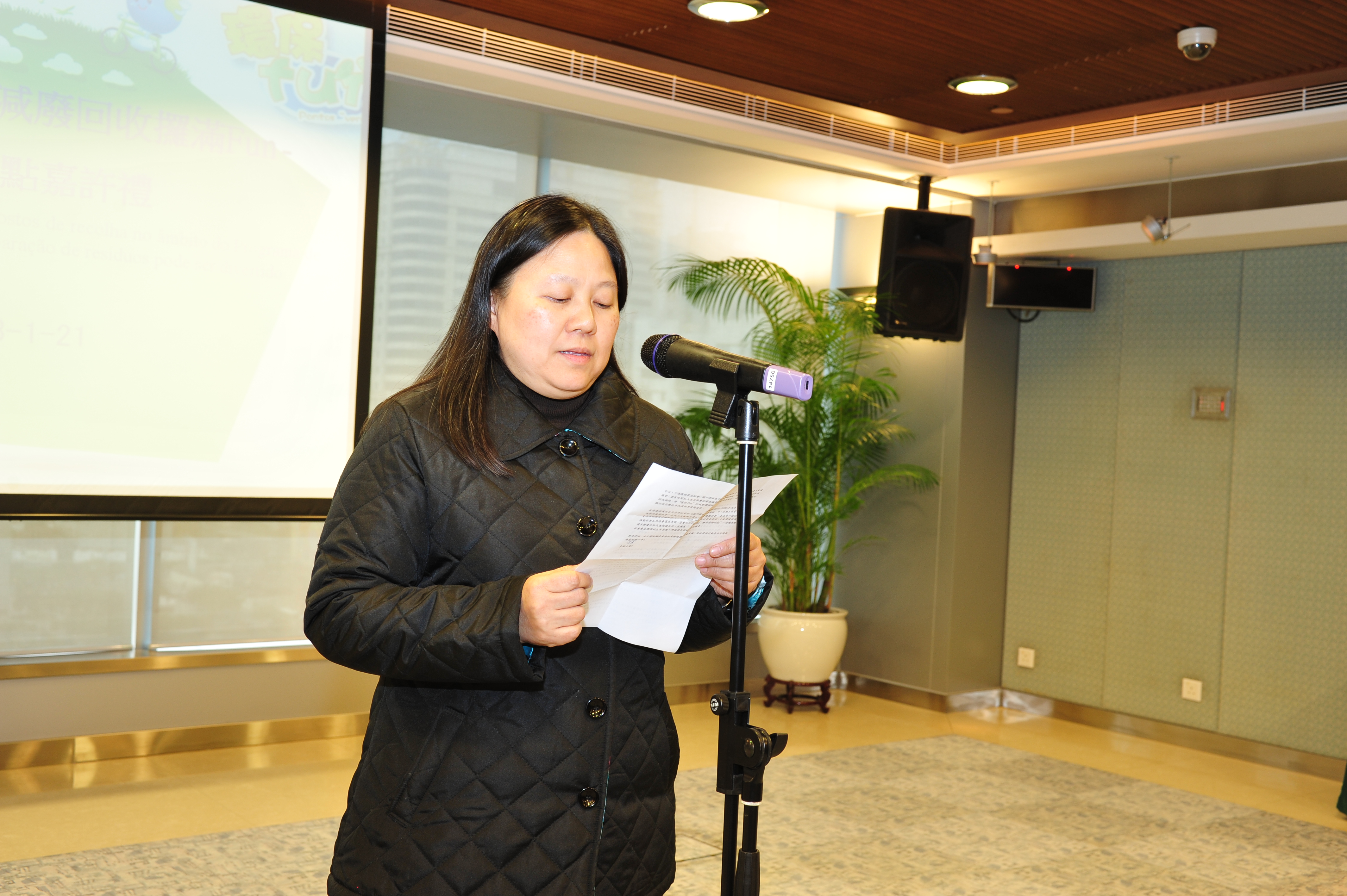 在嘉許儀式上,環境保護局黃蔓葒副局長以及澳門街坊會聯合總會吳小麗理事長向12個為資源回收付出不懈努力的回收站點代表、雅廉花園以及越秀花園兩間作回收試點的私人大廈的代表頒贈嘉許狀,同時亦安排了回收站點的負責人員現身說法,介紹回收站點的運作情況、闡述作為“環保Fun”回收站的意義及使命、以及分享於社區協助推行環保工作的體會和感受,如何把環保理念廣泛地傳揚開去,並推進環保理念的付諸實行。