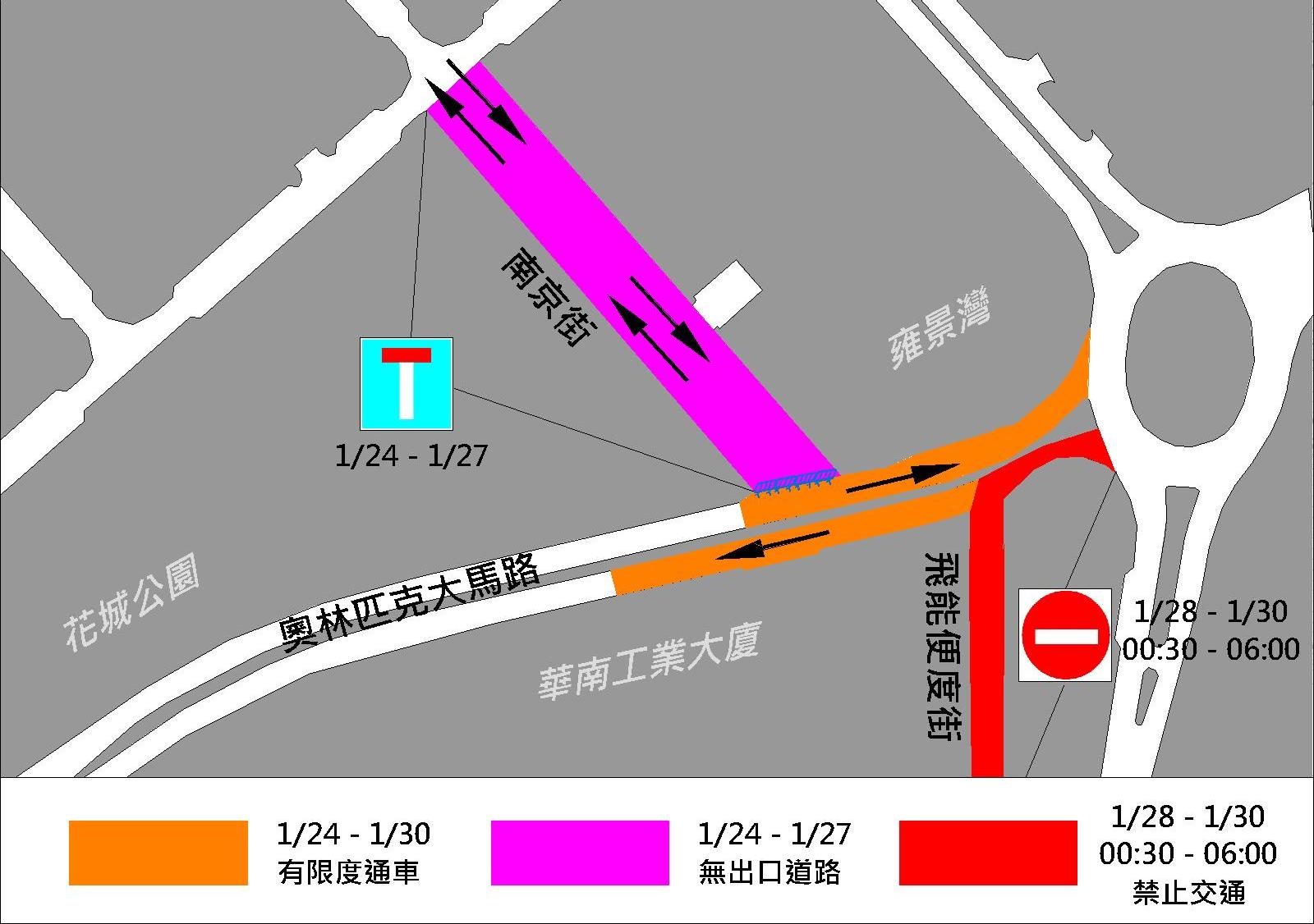 由24日(周四) 上午9時30分起至27日(周日),介乎南京街至亞利雅架圓形地的一段奧林匹克大馬路實施有限度通車,同時,介乎埃武拉街至奧林匹克大馬路的一段南京街臨時改為無出口道路;28日(周一) 上午9時30分起至30日(周三)近華南工業大廈的一段奧林匹克大馬路則實施有限度通車,與此同時,為減少工程對市民日間出行造成的影響,介乎亞利雅架圓形地至飛能便度街的一段氹仔奧林匹克大馬路(往運動場圓形地方向),於上述同一時間每日凌晨12時30分至早上6時實施封閉交通,禁止車輛經亞利雅架圓形地駛入飛能便度街及氹仔奧林匹克大馬路,期間,車輛可使用基馬拉斯大馬路進入氹仔市區。