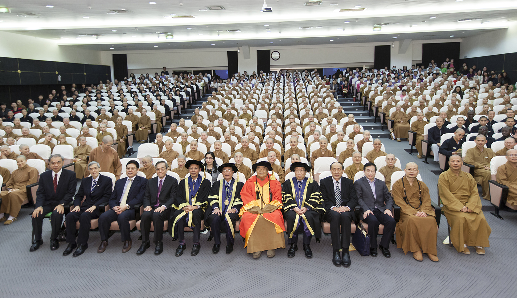 澳大一行於昨日下午抵達高雄佛光山道場,受到佛光山開山宗長星雲大師熱情接待,隨後於佛光山傳燈樓集會堂內舉行頒授儀式,近千位星雲大師弟子在場出席見證。趙偉校長宣讀讚辭時表示,星雲大師以智言善行創造人間佛教的輝煌,致力於世界宗教和融共存。大師70餘年不懈努力,以弘揚“人間佛教”為宗風,全力推動佛教教育、創建多所大學、50餘所中華學校及16所佛教學院,構成橫跨五大洲、澤被全球的佛光教育世界。此外,大師曾在澳門中華文化交流協會和澳門大學演講,深深啟發人心。澳門大學讚賞大師的宗教情懷,更祝福大師的巨大成就。大師在澳門信眾中擁有崇高地位,在澳門社會享有卓越威望,澳大深感榮幸能與星雲大師結緣。
