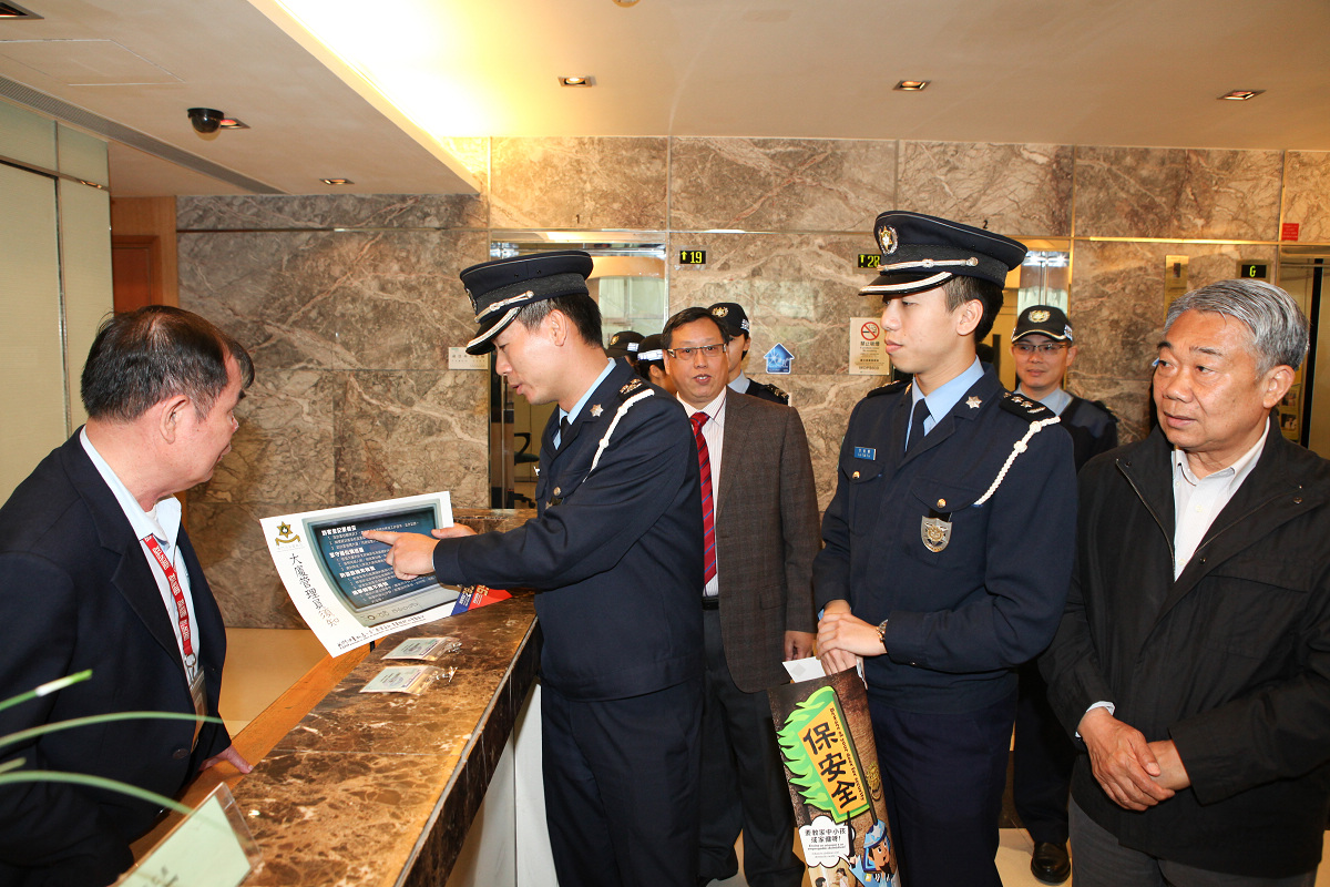 在冬防期間,防盜意識須加以提升,使社區防範及時落實。為此,治安警察局聯同物業管理業商會及物業管理專業人員協會於今天上午,聯袂到離島區向約五十幢大廈進行歲晚防罪宣傳活動,並藉新春來臨之際關懷前線管理人員,加強日後溝通合作。