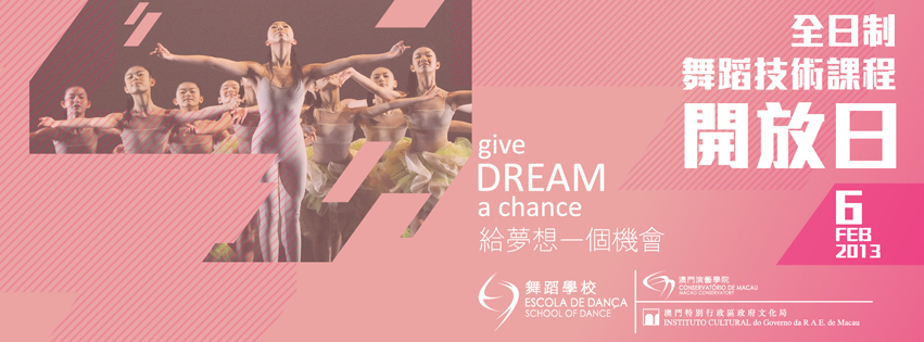 是次開放日將以“給夢想一個機會”(Give Dream A Chance)作為主題,以活潑、輕鬆之遊戲方式引領參觀者尋覓夢想,為參觀者深入淺出介紹學校概況,透過普及與專業的學生表演、精選的舞蹈課堂、家長分享會等,讓大眾進一步了解全日制“舞蹈技術課程”的教學內容和學習情況。