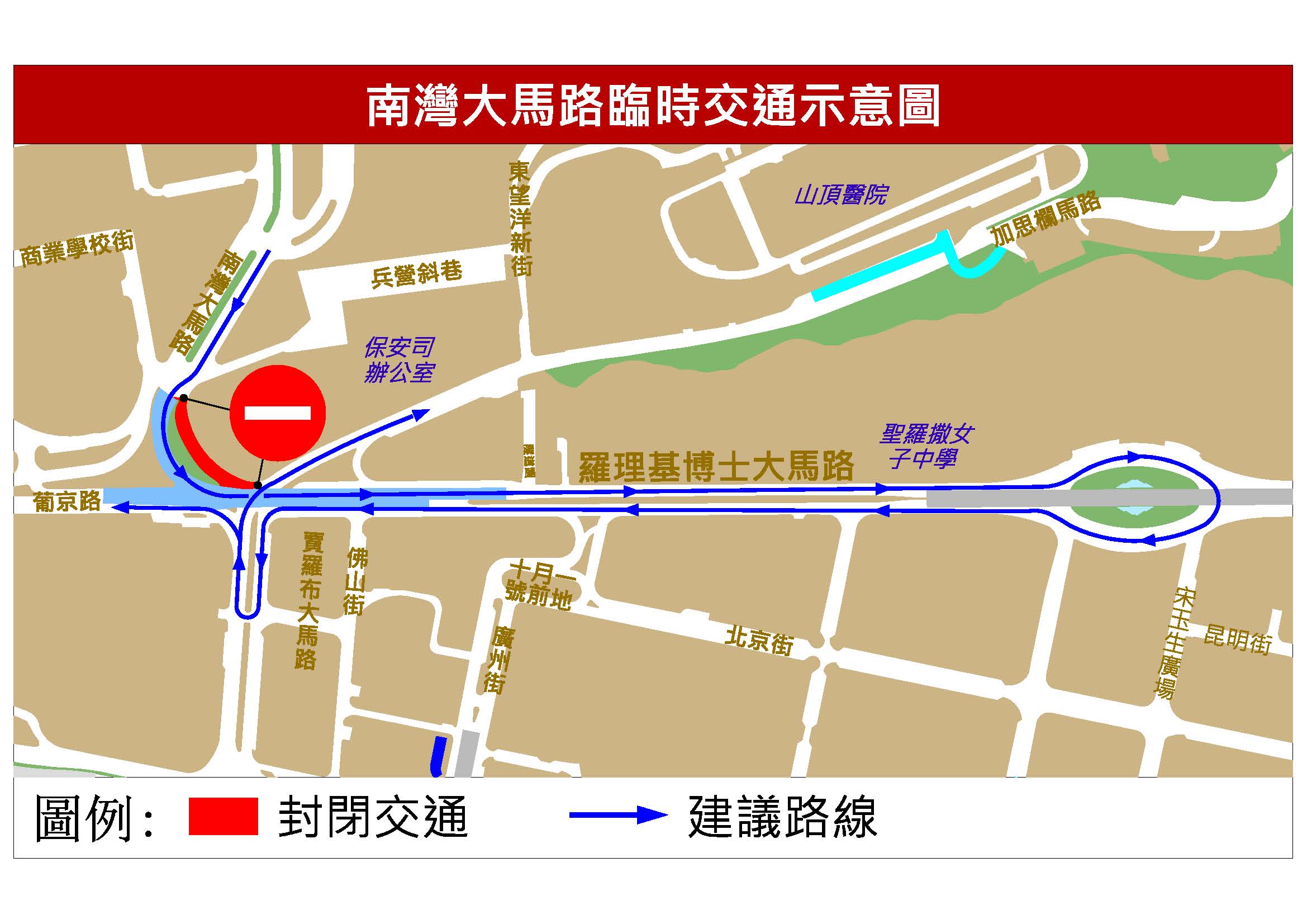 因重鋪路面,南灣大馬路近兵營斜巷的路段將於本月7日(周四)凌晨零時30分至早上6時封閉交通,期間,往加思欄馬路之車輛,可經加思欄行車天橋、羅理基博士大馬路及賈羅布大馬路前往。