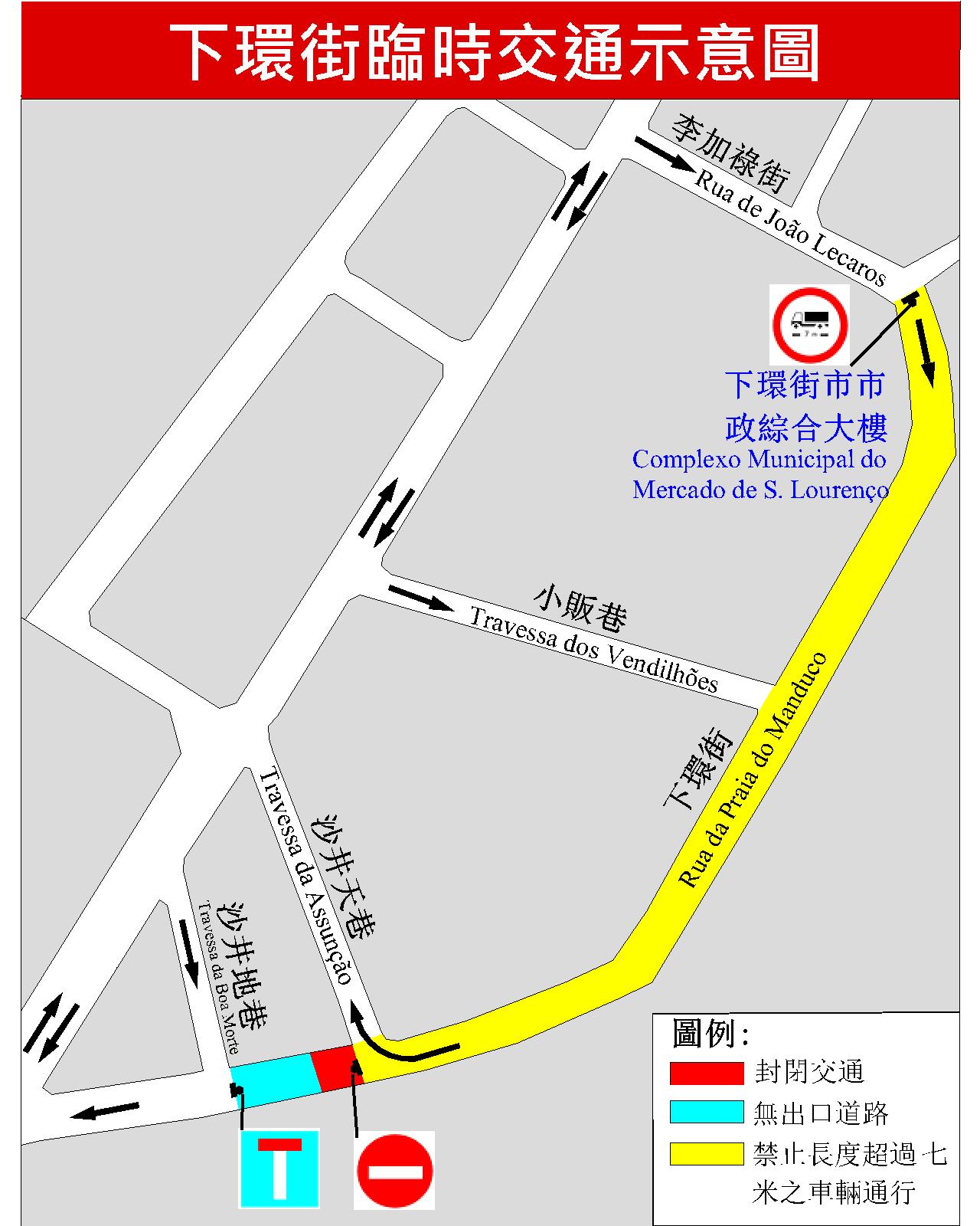 配合民政總署開展鋪設渠道工程,明日(周五)上午10時至10日(周四)晚上12時,下環街近豐環大廈(第四座)的路段將實施封閉交通及禁止泊車;而介乎沙井地巷與豐環大廈(第四座)之間的一段下環街將臨時改作為無出口道路;同時,禁止車身長度超過7米的車輛由李加祿街進入下環街,進入下環街的車輛可由沙井天巷前往河邊新街。
