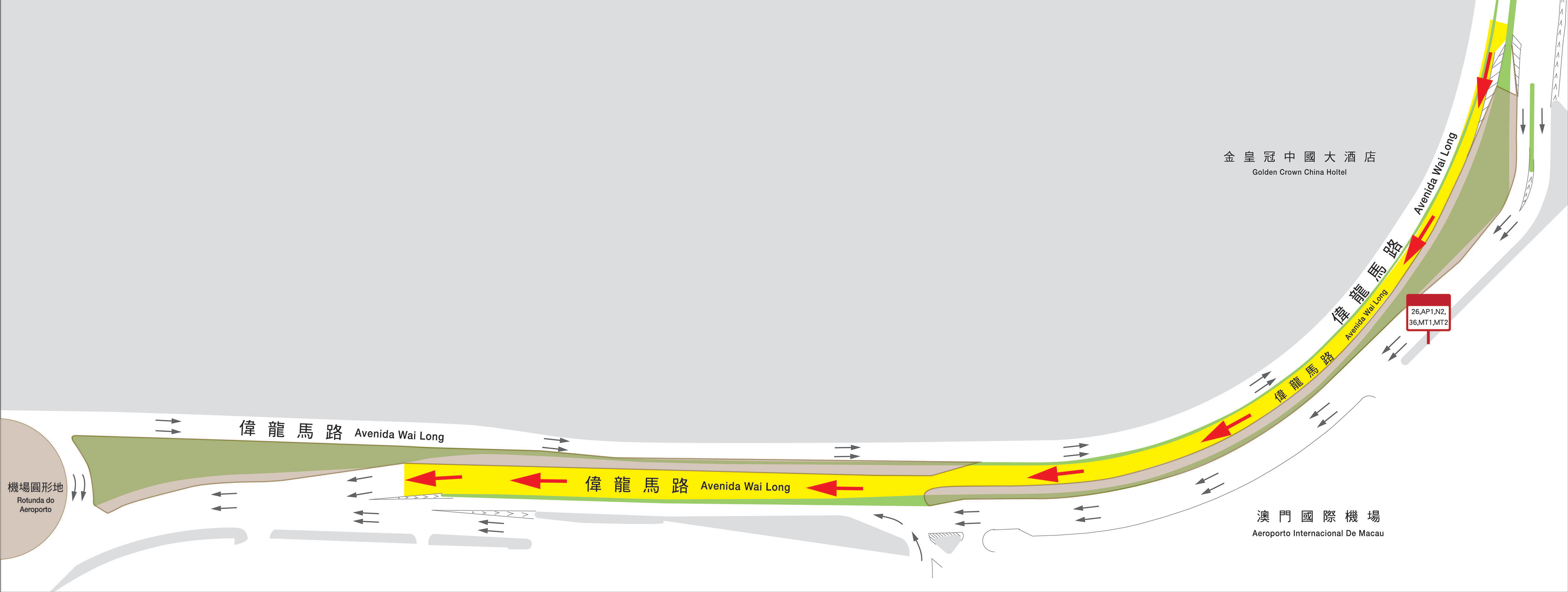 • 途經國際機場對開偉龍馬路往科大方向收窄至單線行車