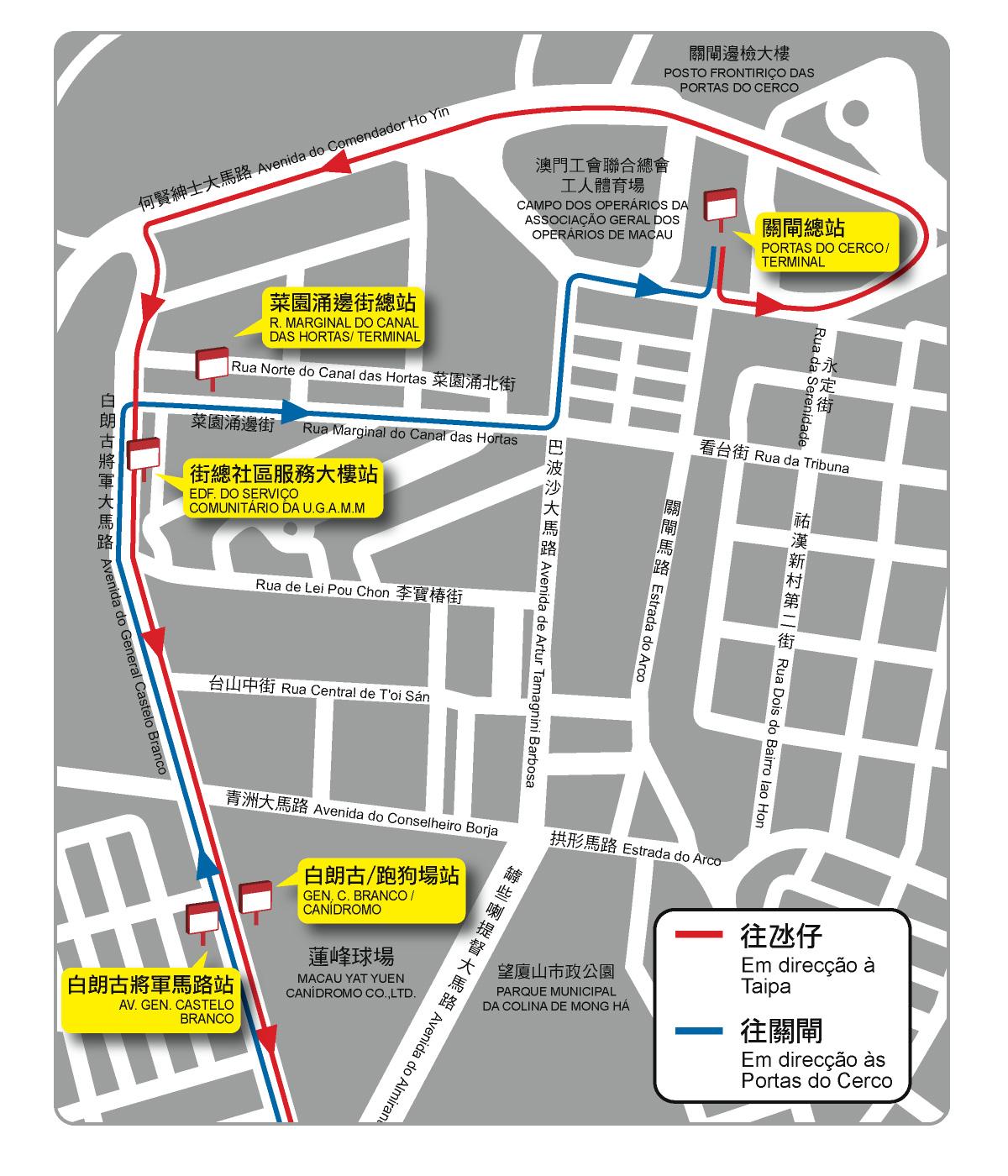 因應台山白朗古將軍馬路及李寶椿街經已貫通,為紓緩周邊的巴波沙大馬路及關閘馬路等道路的交通壓力,並利用新闢道路加快周轉以提升班次,同期還將調整原來行經上述道路的16及25X路線;其中,16路線按原線行駛至停靠“雅廉訪/聖心”站後,將改為停靠“提督馬路/白朗古”站、“白朗古將軍馬路”站至“菜園涌邊街總站”,取消途經巴波沙大馬路、何賢紳士大馬路。而往氹仔方向的25X路線,從“關閘總站”開出後,將改為停靠“街總社區服務大樓”站、“白朗古/跑狗場”站後,按原線行駛,取消途經看台街、關閘馬路、三角花園;至於往關閘方向的25X路線,按原線行駛至“白朗古將軍馬路”站後,將改為停靠“菜園涌邊街總站”後返回 “關閘總站”,取消途經台山街市、巴波沙大馬路。