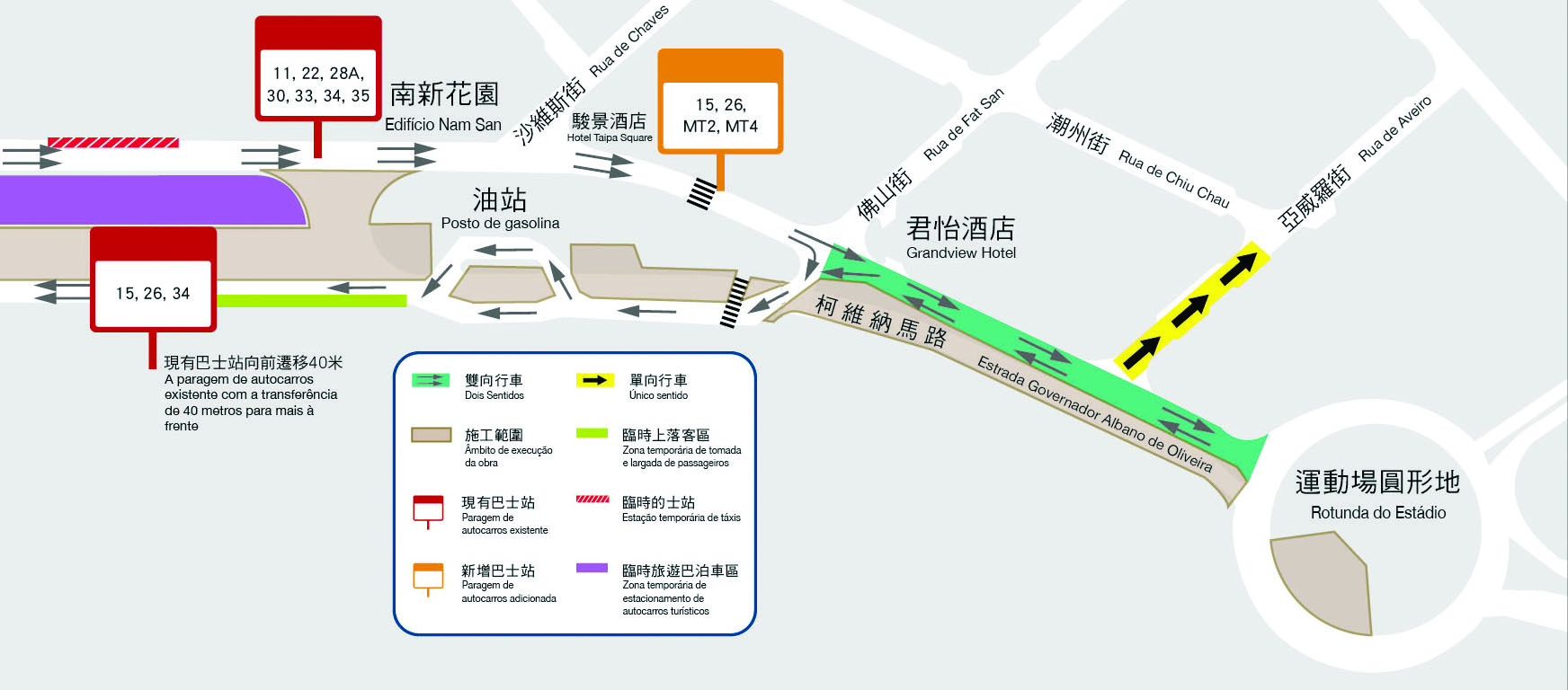 氹仔運動場道輕軌工程今日(16日)早上10時起試圍封運動場道近馬會一側的兩條行車道,同時,一併開通由學院路右轉望德聖母灣大馬路的新闢道路,以維持現有的交通流向。隨著上述工程的開展,柯維納馬路近賽馬會東側的兩條行車道稍後亦將進行圍封,並改為雙向單線行車。配合有關臨時交通安排,將取消“匯景花園”巴士站,並於駿景酒店前設置新站,分流“南新花園”巴士站的壓力,相關巴士路線亦會作調整。運輸基建辦公室及交通事務局呼籲公眾留意。