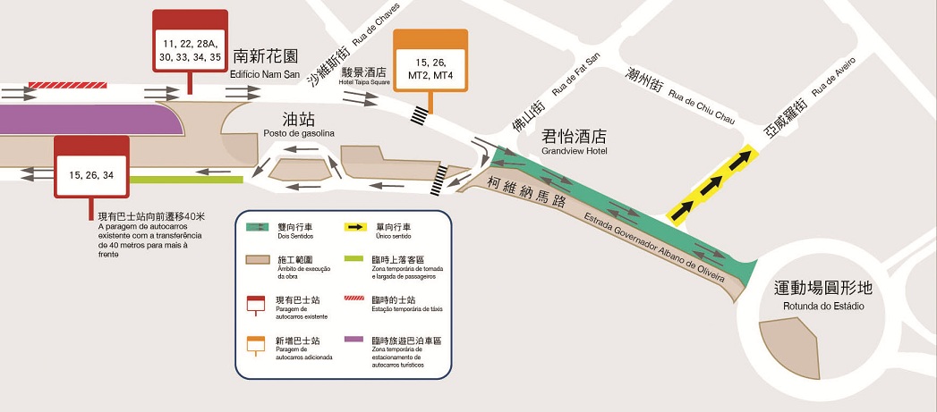 因應相關臨時交通安排,途經柯維納馬路的巴士路線及站點也需要作調整:由今(29日)首班車起,取消“匯景花園”巴士站,並於駿景酒店前設置新巴士站(“駿景酒店”巴士站),以分流“南新花園”巴士站的壓力,盡量減低公眾乘坐巴士出行的影響。經調整後,11、22、28A、30、33、34及35路線維持停靠“南新花園”巴士站,15、26、MT2及MT4路線則分流停靠新設的“駿景酒店”巴士站;另一方面,由於柯維納馬路近賽馬會一側將收窄至單線行車,考慮到“賽馬會1”巴士站停靠的路線眾多,為避免多條巴士路線同時靠站影響交通暢順度,22、28A、30、33、35、MT1及MT4取消停靠“賽馬會1”巴士站,乘坐上述巴士路線的乘客可使用“南新花園”巴士站或“駿景酒店”巴士站。