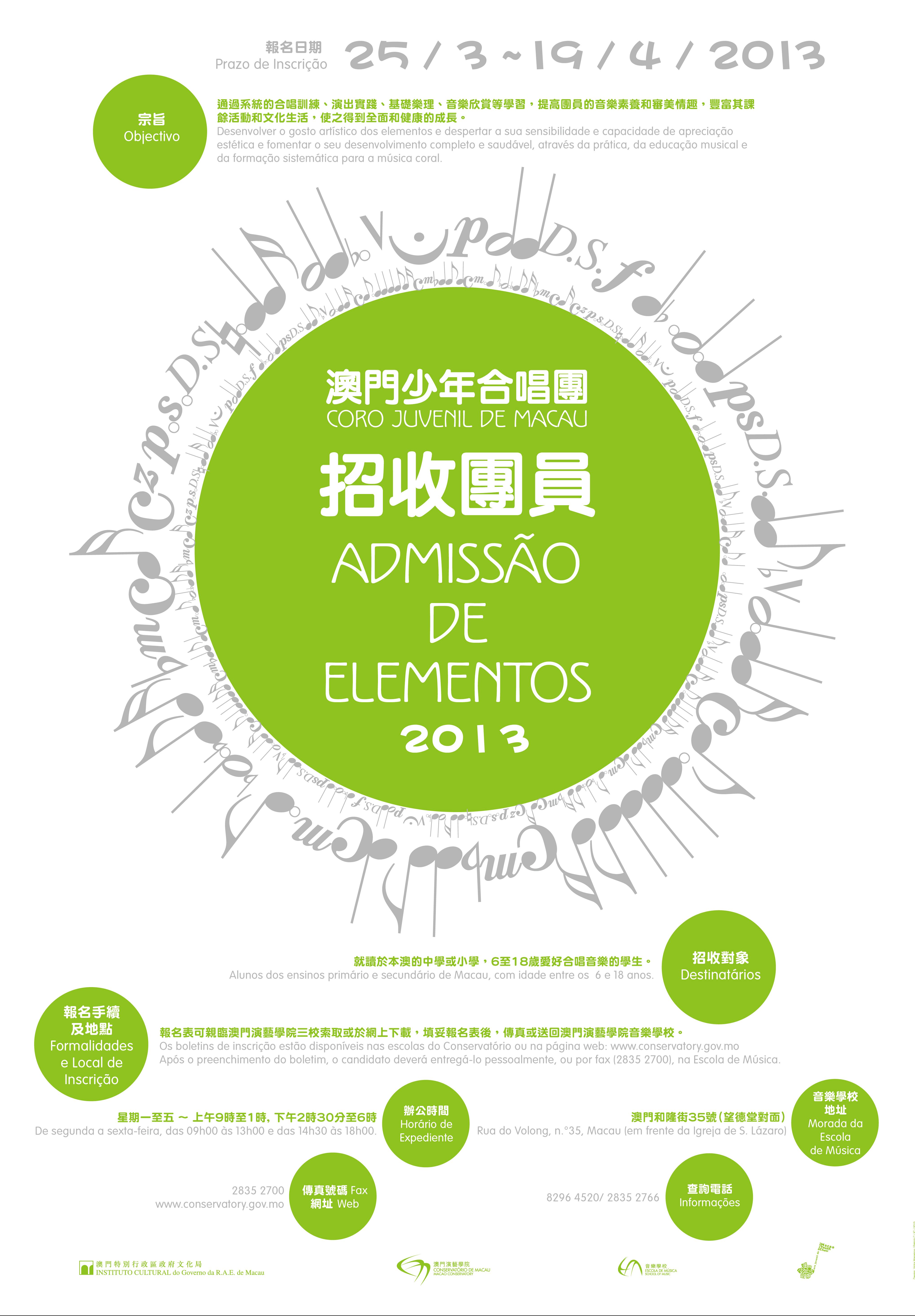 澳門少年合唱團正朝向成為本澳具代表性的表演藝術團體的目標進發,是次團員招募期至四月十九日,有關章程及報名表可於澳門演藝學院三校索取,或於演藝學院網頁www.conservatory.gov.mo下載,填妥報名表後可傳真二八三五二七零零或送回和隆街三十五號(望德堂對面)澳門演藝學院音樂學校。查詢可於辦公時間致電二八三五二七六六。