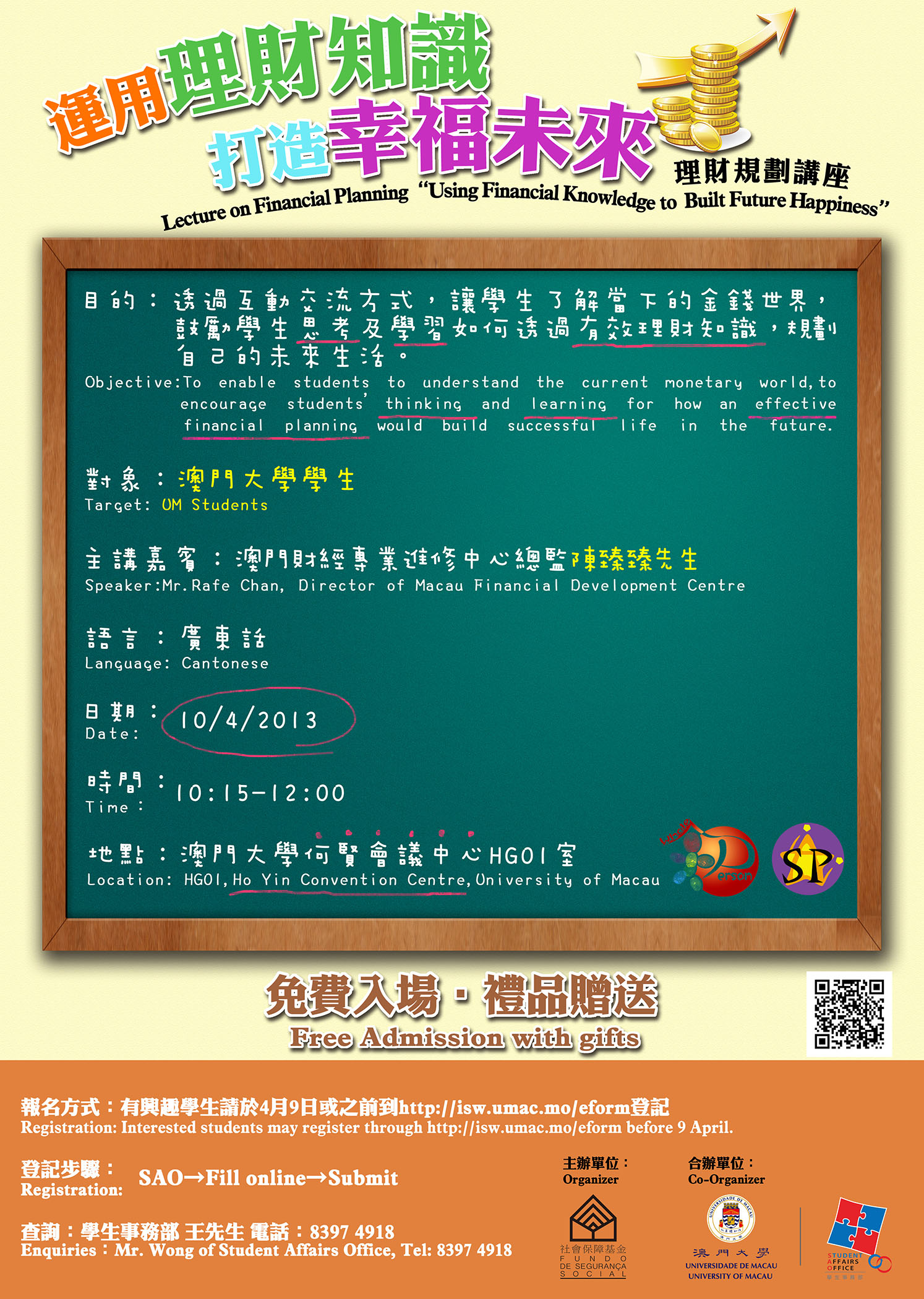 由社會保障基金主辦、澳門大學協辦的“運用理財知識打造幸福未來”理財規劃講座將於本周三(10日)上午10時15分至中午12時假澳門大學何賢會議中心HG01室舉行,講座對象為校內學生。講座將由澳門財經專業進修中心陳臻臻總監擔任主講,向學生講解基礎的理財知識,鼓勵學生思考及學習如何透過有效理財及早規劃自己的未來生活,主辦單位並會向學生介紹雙層式社會保障制度與他們的密切關係。