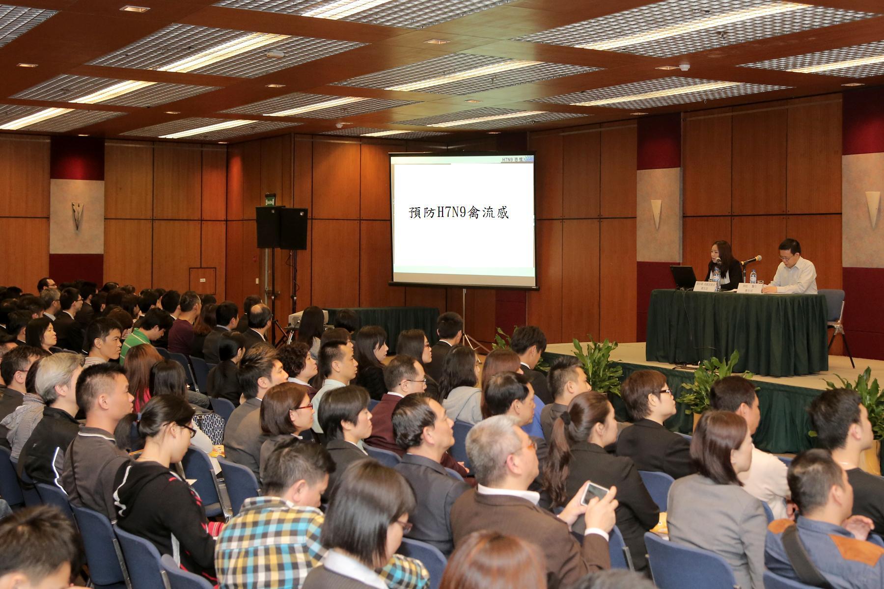 此外,因應內地「五.一黃金周」將有大量旅客訪澳,衛生局和旅遊局分別以旅行社和酒店業為對象聯合舉辦了兩場專場講座。講解H7N9禽流感現時的疫情、預防方法以及針對旅行社和酒店業界的指引。同場亦解答了與會者的疑問。另外,衛生局於今亦應邀派員到澳門大學為學生、工作人員及外判清潔工人講解預防H7N9禽流感的知識,以加強上述人士對該疾病的認識。