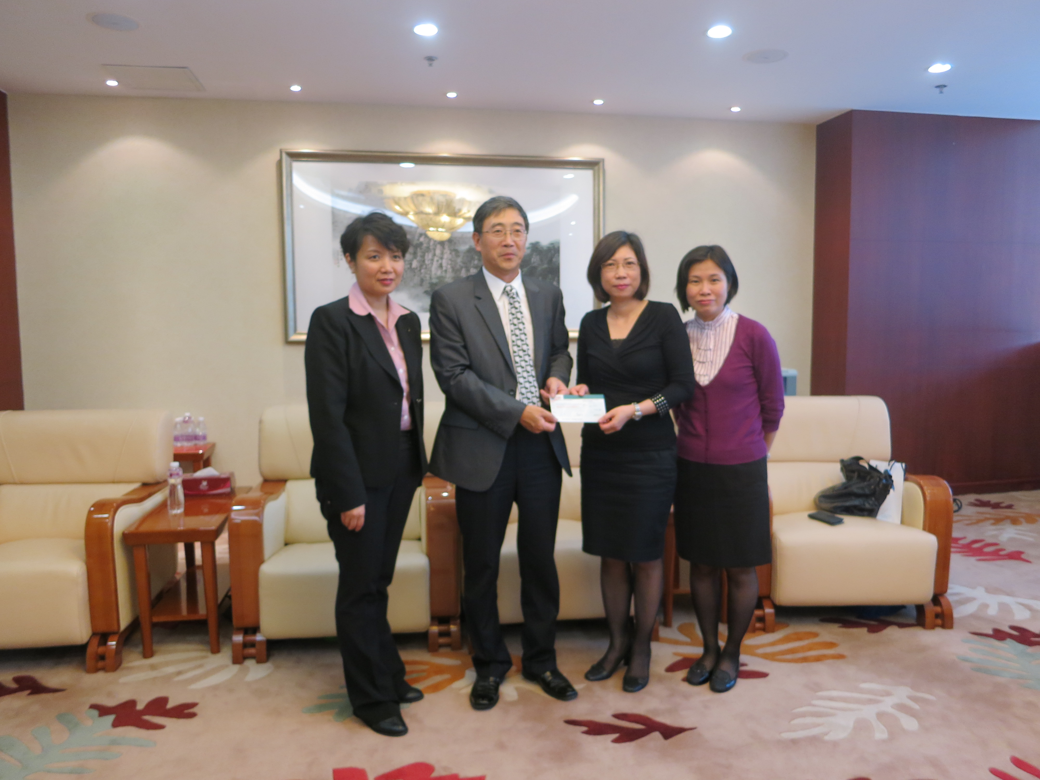 澳門生產力暨科技轉移中心副理事長莫苑梨和高級經理關治平昨下午將善款支票送到澳門中聯辦,由中聯辦經濟部高尚德部長級助理接收,他感謝《澳門時尚廊》對受地震災難影響的雅安同胞心意。