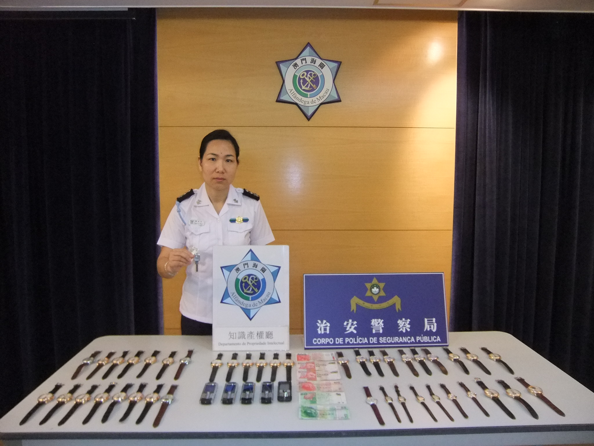 澳門海關與治安警察局持續聯手在社區進行防罪滅罪,於五月十五日,在氹仔區某大型酒店內,治安警接獲酒店保安部舉報,報稱在酒店管轄區域內,發現有一名正在向途人兜售涉嫌侵權偽冒手錶的外地男子,海關知識產權廳跟進偵查後,於澳門中區一單位內搜獲一批侵權貨物,並懷疑此假貨存取窩點為非法旅館。