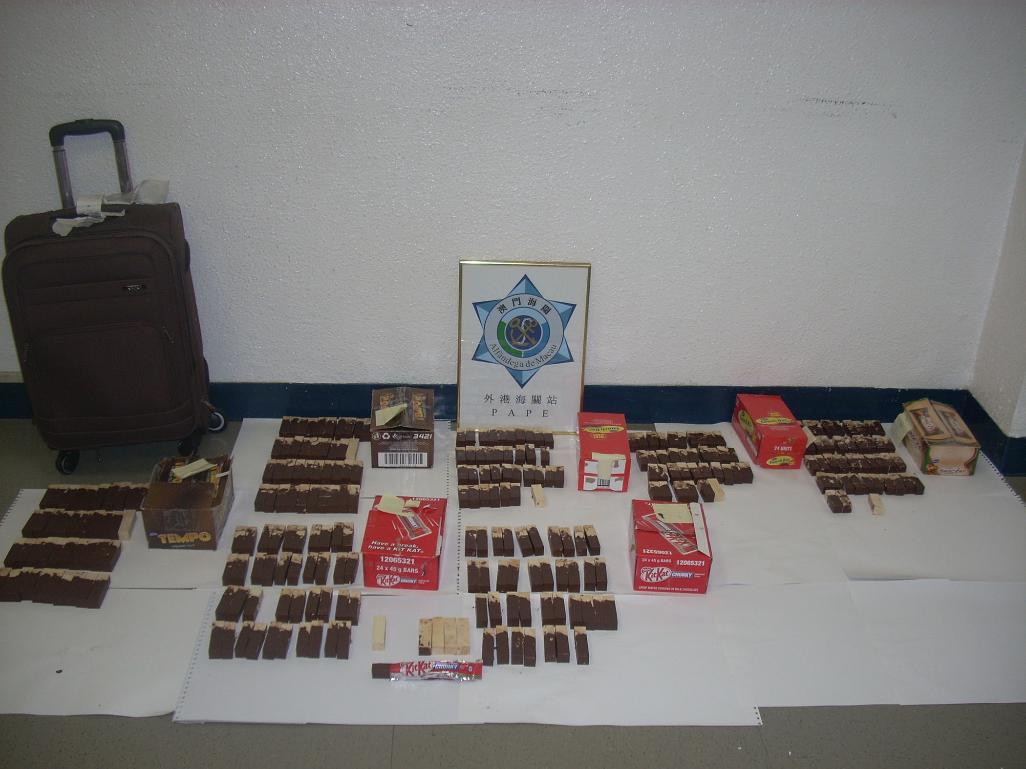 澳門海關再次從一名旅客行李中查獲偽裝朱古力的象牙,該名旅客試圖將7合,合共277條,重約16.3公斤偽裝成朱古力的象牙經外港客運碼頭偷運入境,初步估計該批象牙市值約為澳門幣二十八萬。
