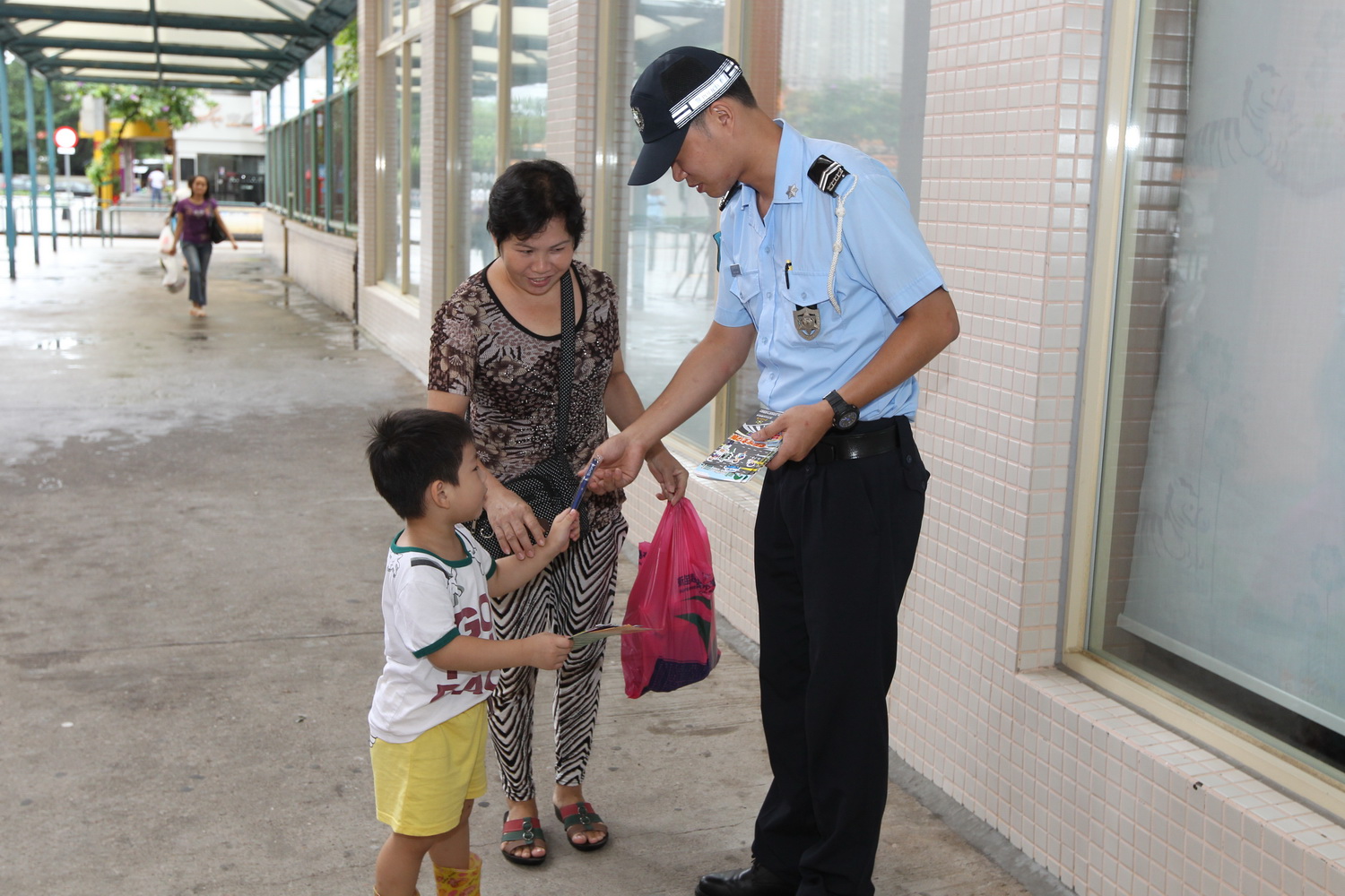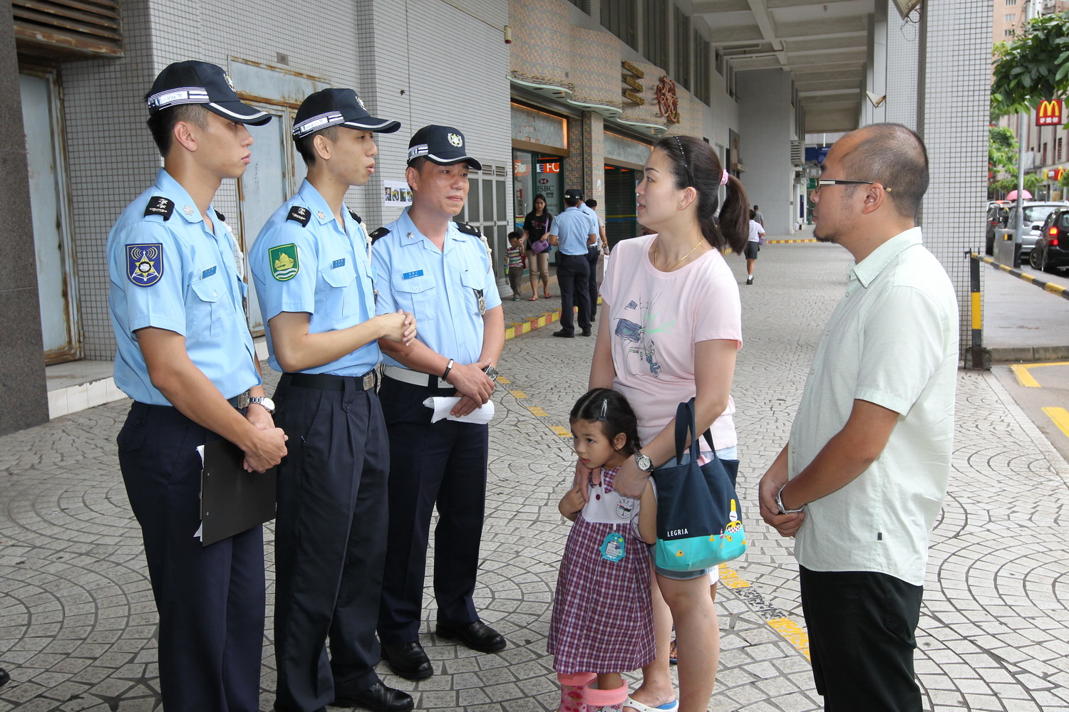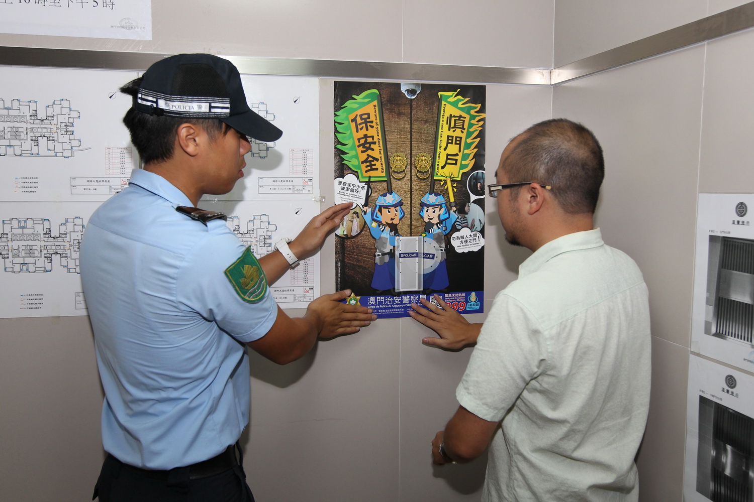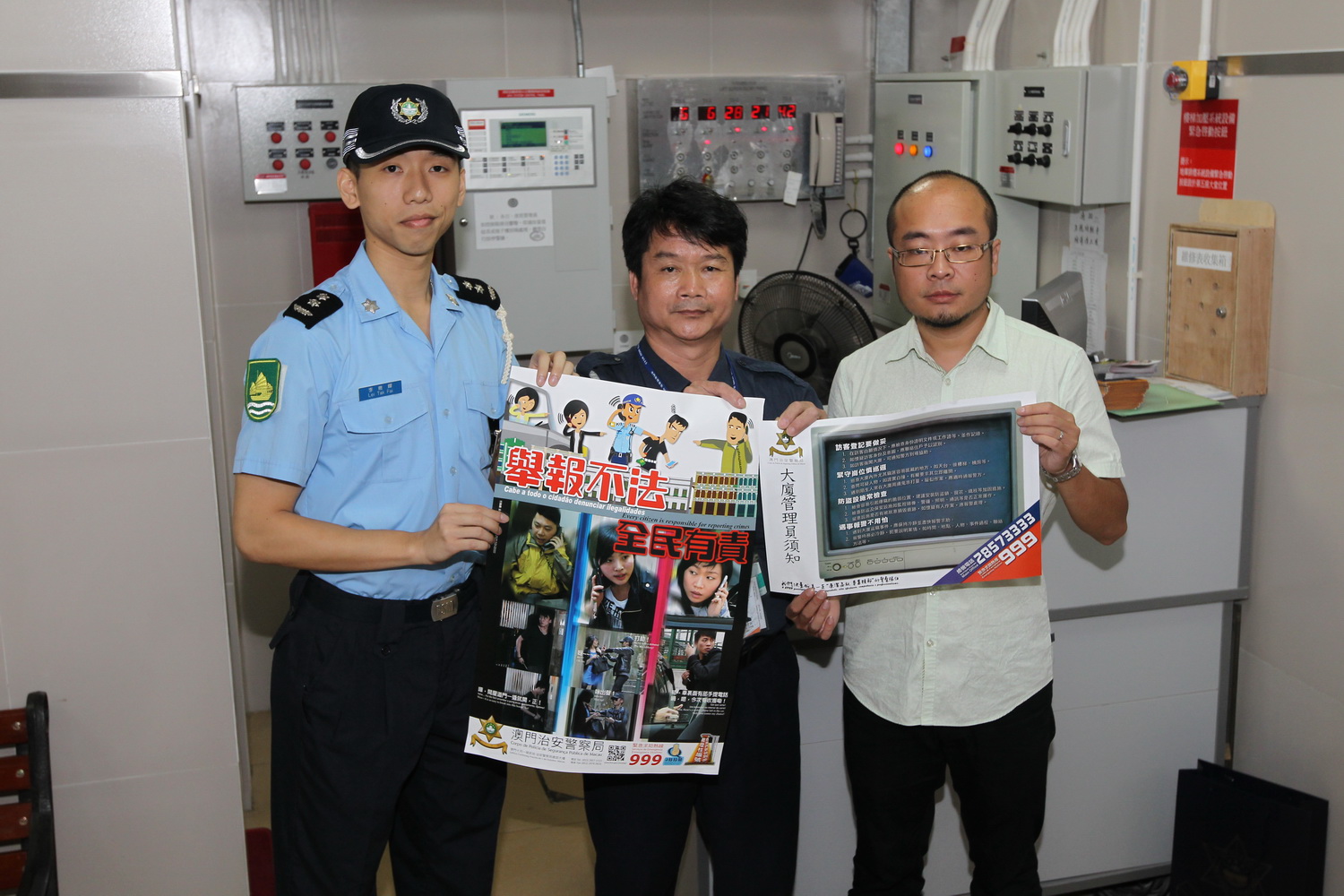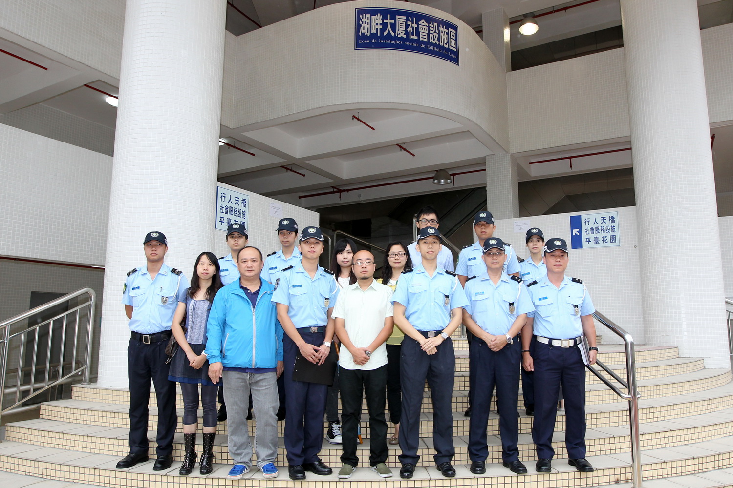 是次巡察由本局海島警務廳氹仔警務警司處副警司李德輝及行動廳公關處副警司余志華率警務人員一行十人,與街總離島辦主任鄭煜、氹仔坊會副理事長阮若華、街總氹仔社區中心主任黃雪儀、以及街總離島社諮委代表江旭純和程順明等一行七人,到湖畔大廈和花城一帶接觸前線管理員及街坊住客,了解區內治安交通環境狀況,聆聽訴求,並派發各種防罪和交通安全小冊子及張貼海報。