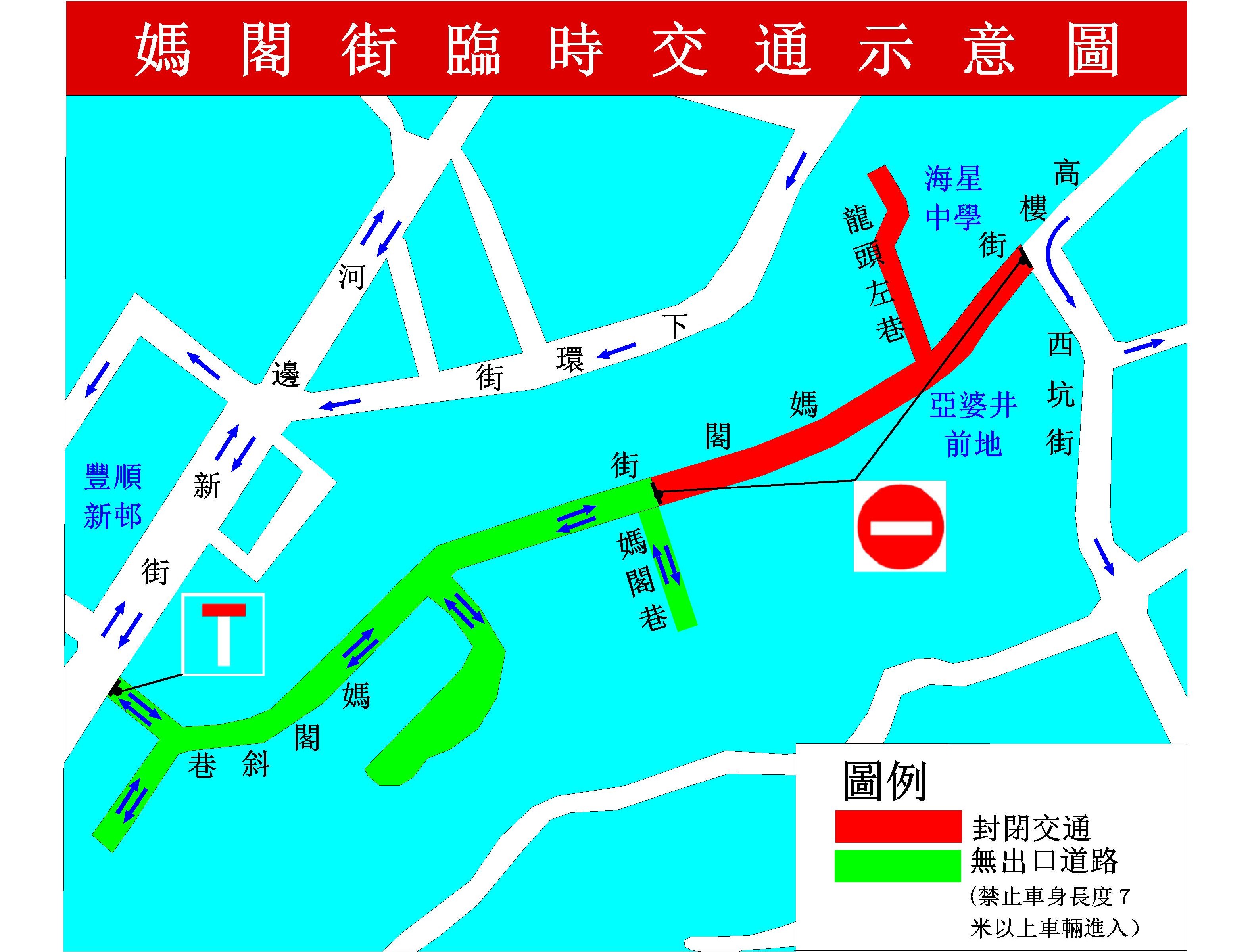 因新建大廈接駁水、電、電訊及街渠,介乎西坑街與龍頭左巷之間的一段高樓街、介乎龍頭左巷與媽閣巷之間的一段媽閣街以及龍頭左巷,周六(27日)上午10時起臨時封閉交通,除海星中學、鴻運樓及威廉閣停車場車輛外,禁止其他車輛駛入。同時,鹹魚街、媽閣斜巷及介乎媽閣斜巷與媽閣巷之間的一段媽閣街則列作無出口道路,並禁止車身長度超過7米的車輛進入,前往媽閣巷附近的車輛需經河邊新街行駛。工期約15日。