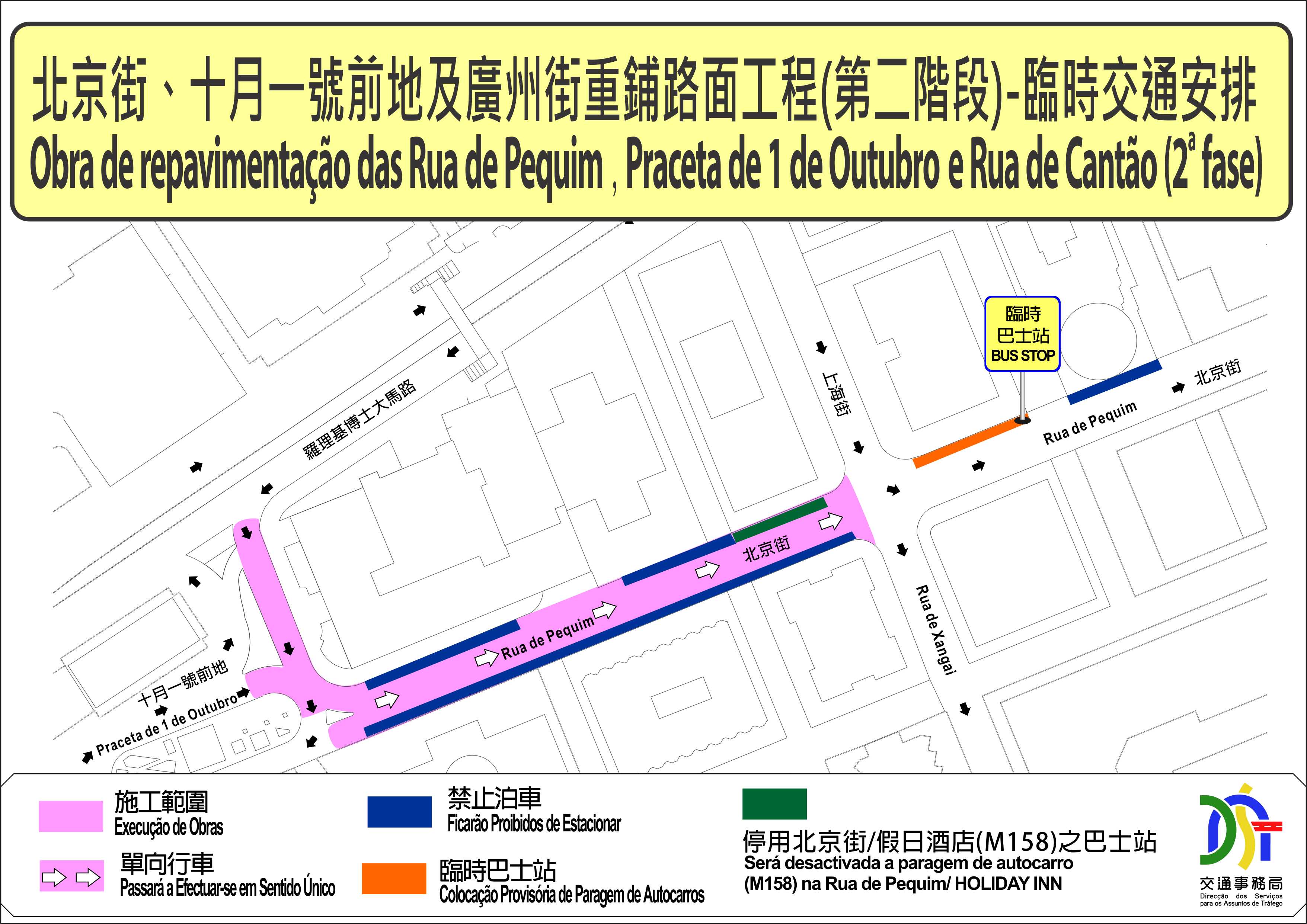 配合民政總署重鋪路面,介乎十月一號前地與上海街之間的一段北京街,將於周一(29日)上午10時起臨時改為單向行車,車輛只可由十月一號前地往上海街方向行駛;北京街及十月一號前地部份道路將實施有限度通車,同時,“北京街/假日酒店”巴士站將向何賢公園遷移。交通事務局呼籲公眾留意。