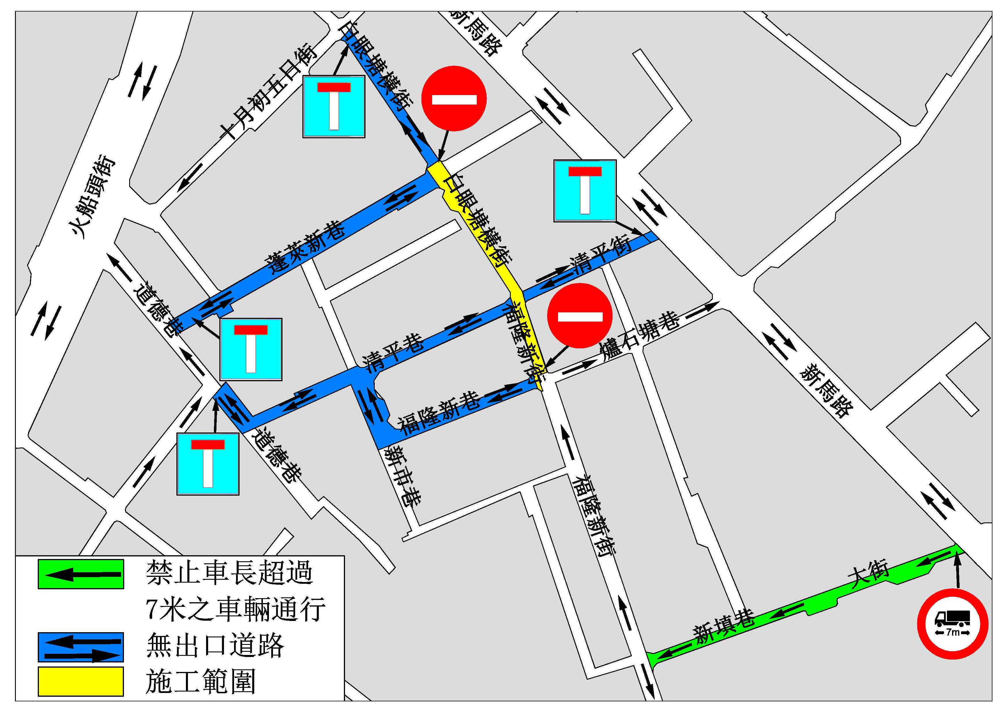 福隆新街及白眼塘橫街的地下水管已使用多年,部份已出現老化情況,為避免影響區內供水,自來水公司明(31日)上午10時起會進行水管更換工程,期間,會封閉介乎蓬萊新巷與福隆新巷之間的一段白眼塘橫街,以及福隆新街的交通,取消設於白眼塘橫街近文華酒店的上落客貨區。同時,介乎道德巷至白眼塘橫街之間的一段蓬萊新巷、介乎道德巷至福隆新街之間一段清平巷、新市巷及福隆新巷、介乎十月初五日街與蓬萊新巷之間的一段白眼塘橫街、介乎福隆新街與新馬路之間的一段清平街會改為無出口道路;並禁止車身長度超過7米的車輛由新馬路進入大街。