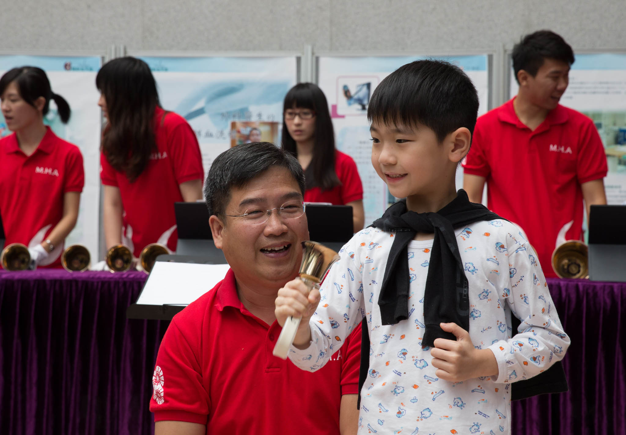 首場“處處有音樂”社區推廣活動由澳門手鈴協會演出,日前他們一行十人於鏡湖醫院第一門診大堂近入口處設置簡單舞台,演譯多首樂曲,現場正等待候診及待領藥之居民紛紛駐足欣賞。期間,樂團指揮石世華更向觀眾講解手鈴的特點,又與在場小朋友互動合奏,讓他們一嘗演奏手鈴及擔任指揮的滋味,小朋友都顯得非常雀躍,熱情投入於表演之中。