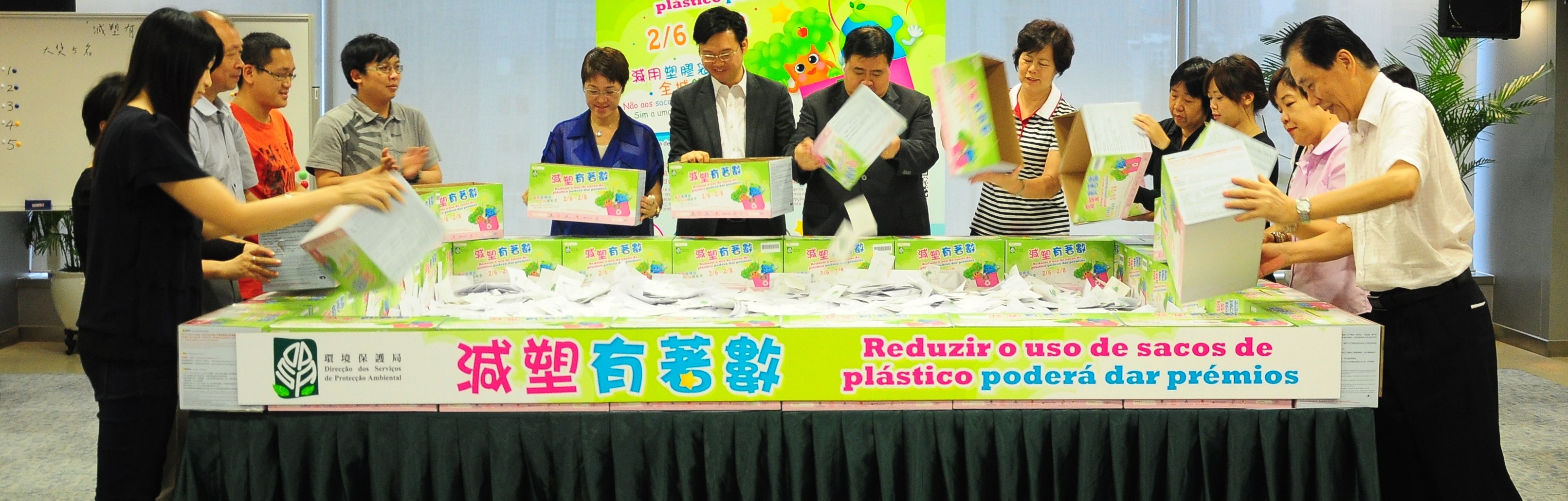 環境保護局於日前舉辦抽獎儀式,抽出大獎5名(單車)、特別獎600名(珍藏版巴士儲值卡)以及安慰獎600名(精美環保禮品套裝)。出席抽獎嘉賓包括環境保護局局長張紹基、消費者委員會執行委員會主席黃翰寧、澳門街坊會聯合總會理事長吳小麗、澳門婦女聯合總會理事長林婉妹、澳門百貨辦館業商會常務理事歐榮陸、澳門工會聯合總會社會服務委員會副主任蘇秀芬、澳門中華新青年協會副理事長余韶洲、澳門中華學生聯合總會副理事長薛巧鳳,以及文采書店、宏基超級市場有限公司、來來超級市場有限公司、南光百貨有限公司、致富有限公司、新苗超級市場有限公司、大昌食品市場/好媽咪專門店、中國國貨公司、新昌棧超級市場、澳門天客隆超市等參與商號代表。