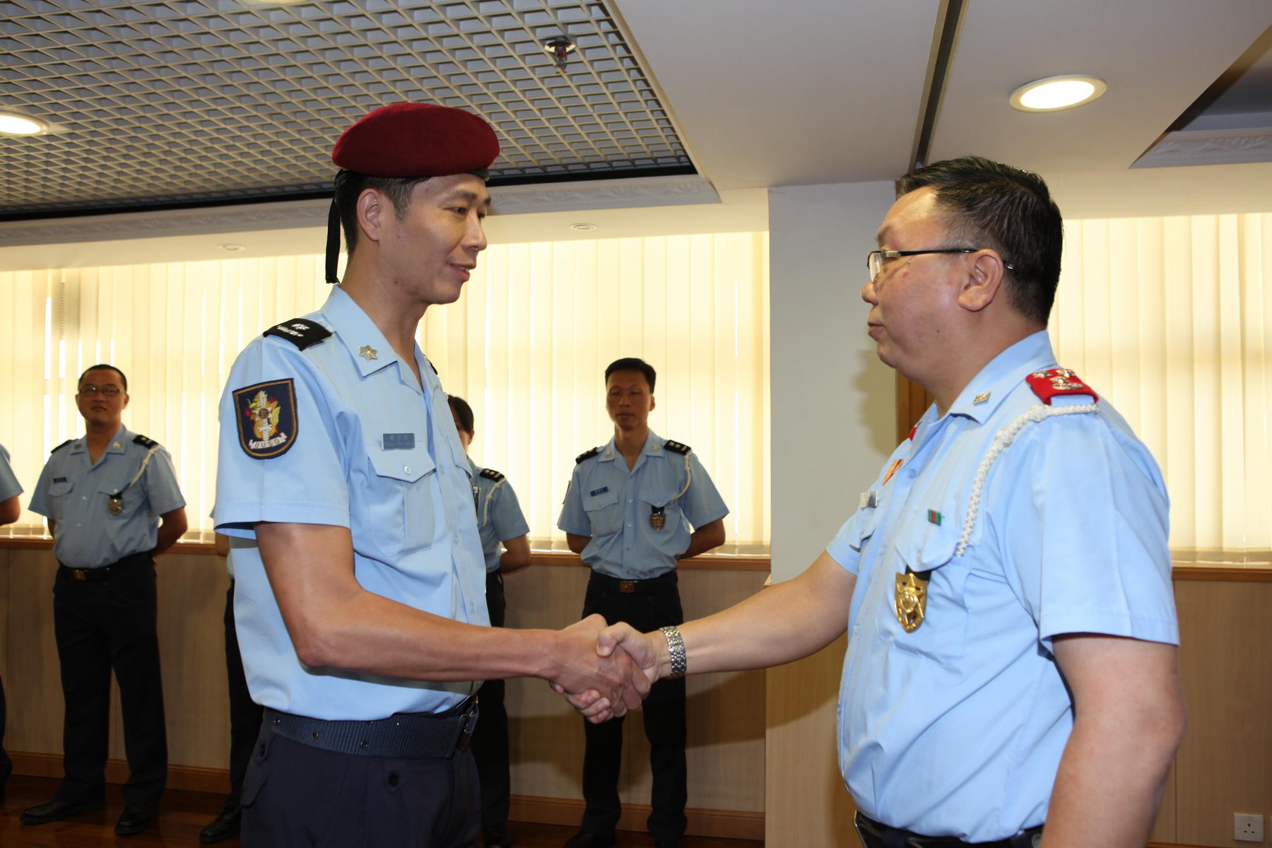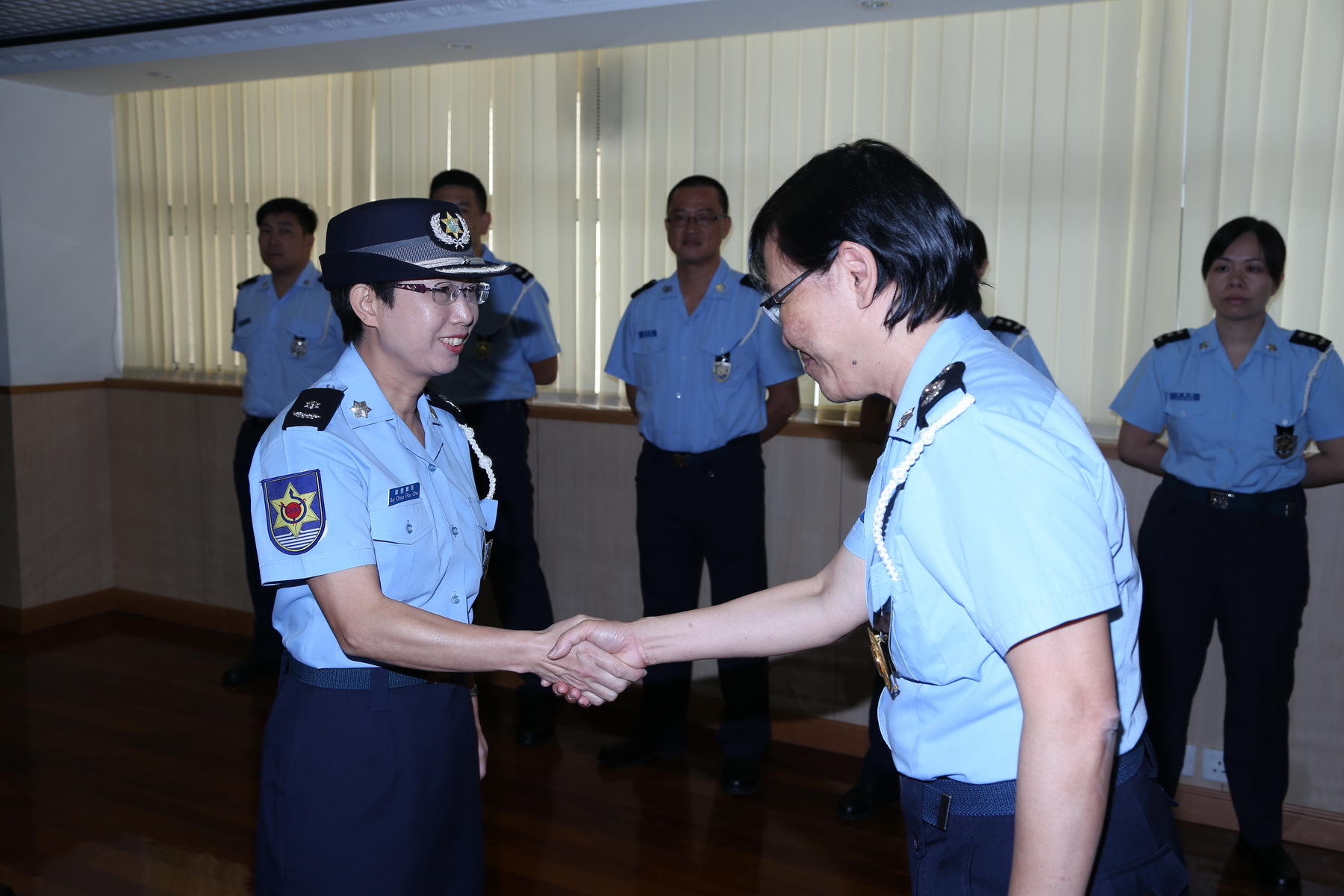 今天(十月二十五日)中午12時,在治安警察局總部貴賓室舉行了警長晉升儀式。儀式由治安警察局局長李小平警務總監及副局長黎錦權副警務總監及梅山明副警務總監主持。出席儀式的還有局內各部門的廳長及負責人,為同僚作出祝賀。晉升為普通職程警長共有13人 (男性11人,女姓2人)。
