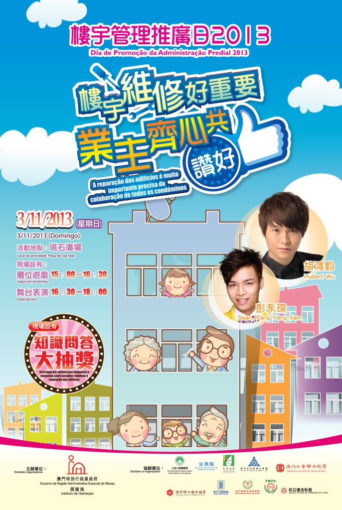 由房屋局主辦,土地工務運輸局、法務局、民政總署、澳門街坊會聯合總會、澳門工會聯合總會、澳門婦女聯合總會、民眾建澳聯盟、澳門工程師學會、澳門物業管理業商會,以及澳門物業管理專業人員協會協辦的「樓宇管理推廣日2013」將於周日(11月3日)下午3時假塔石廣場舉行,現場設有攤位遊戲、專題展板、話劇表演及知識問題大抽獎等,歡迎市民踴躍到場參加。