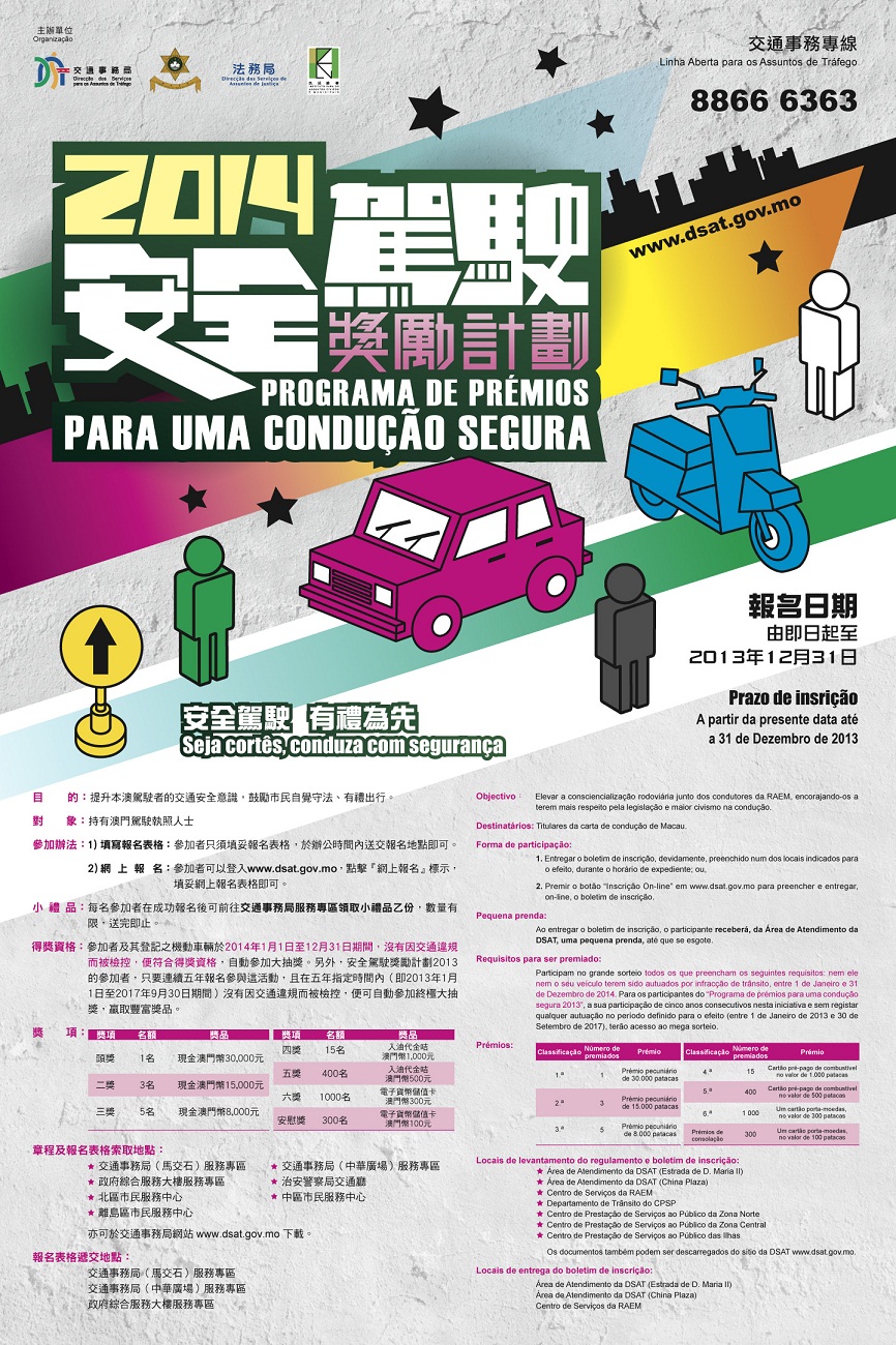 以“安全駕駛 有禮為先”為口號的「2014安全駕駛獎勵計劃」即日起接受報名,凡持有澳門駕駛執照人士可前往交通事務局服務專區、治安警察局交通廳、民政總署轄下的北區、中區或離島區市民服務中心索取章程及報名表格,填妥後交回交通事務局服務專區,或是登入交通事務局網頁www.dsat.gov.mo直接報名,截止日期為12月31日,歡迎市民踴躍參加。