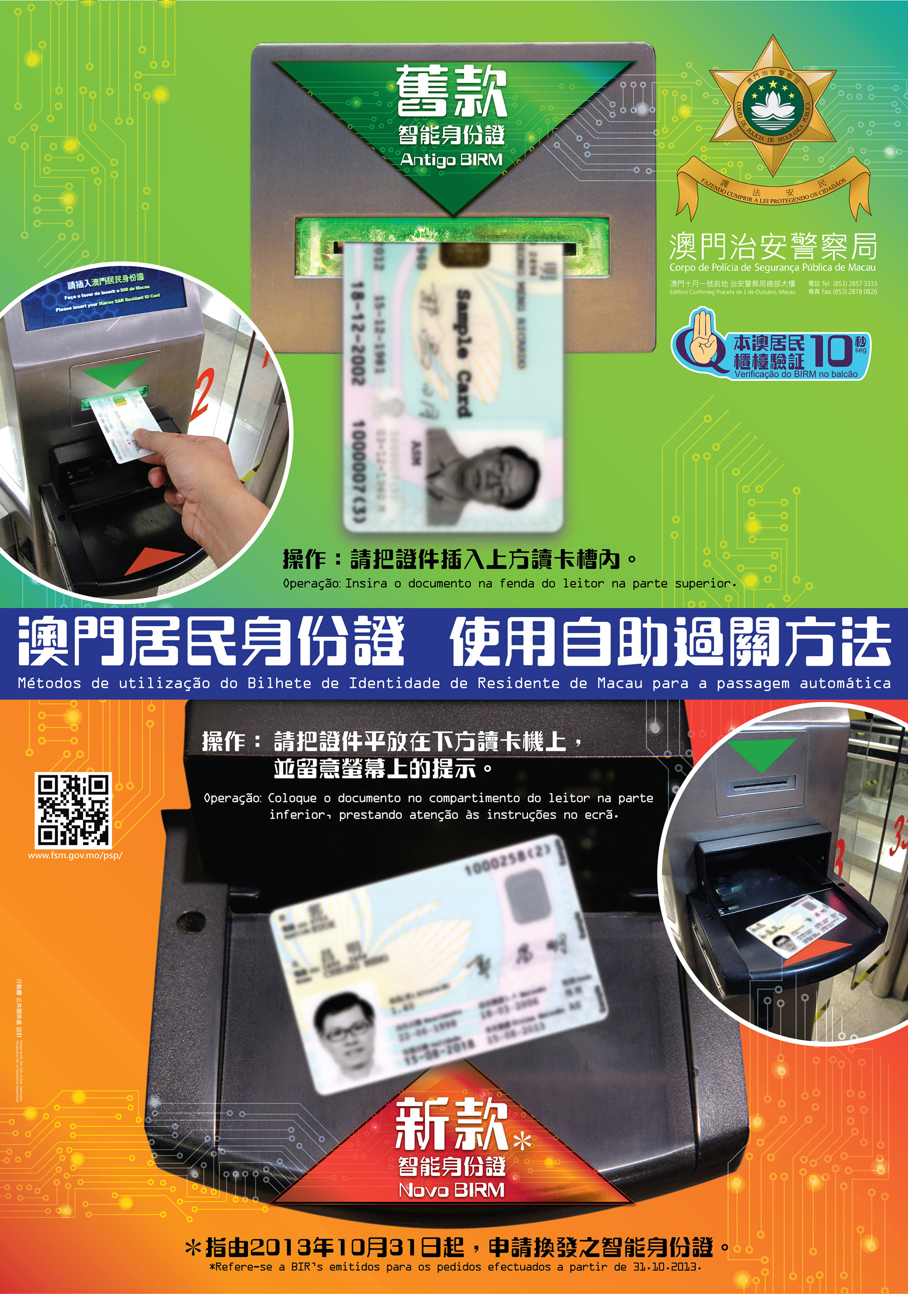 市民在身份證明局領取“新證"時,將同時獲發一指引單張,以便得知使用“新證"自助過關的方法。此外,在本澳各邊境口岸的自助過關系統區域或當眼處亦會張貼大型介紹海報,以及自助過關系統上的電子螢幕會循環播放上述使用“舊證"與“新證"自助過關的示範,讓市民清晰自助過關手續。