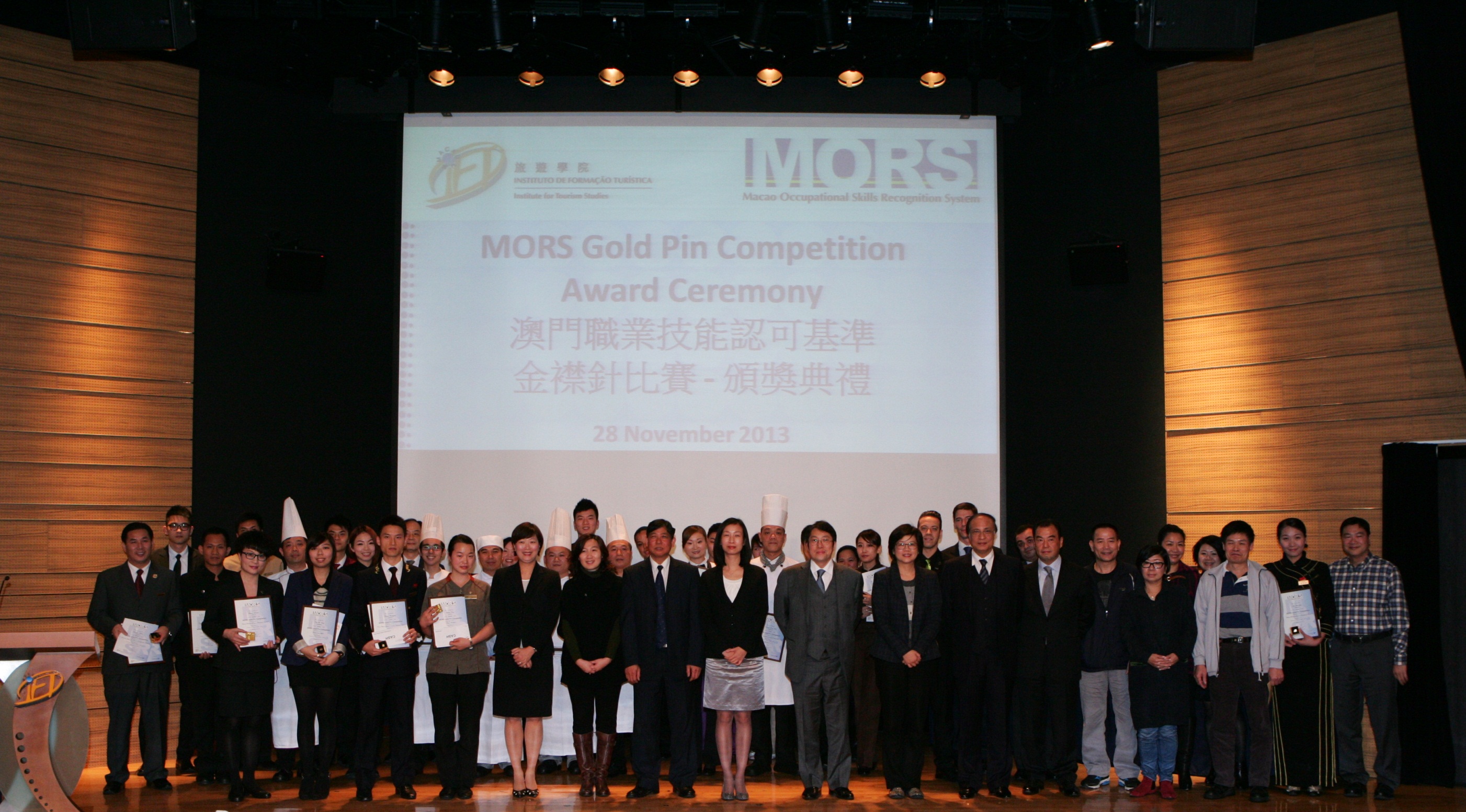 旅遊學院於11月28日舉行『澳門職業技能認可基準』(MORS) 2013金襟針大賽頒獎典禮,由旅遊局局長文綺華女士、勞工事務局副局長丁雅勤女士、澳門酒店旅業職工會李寶來會長、澳門酒店業協會楊振業會長、澳門零售管理協會會長黃亦賢先生及新葡京酒店總經理陳健文先生擔任頒獎嘉賓。