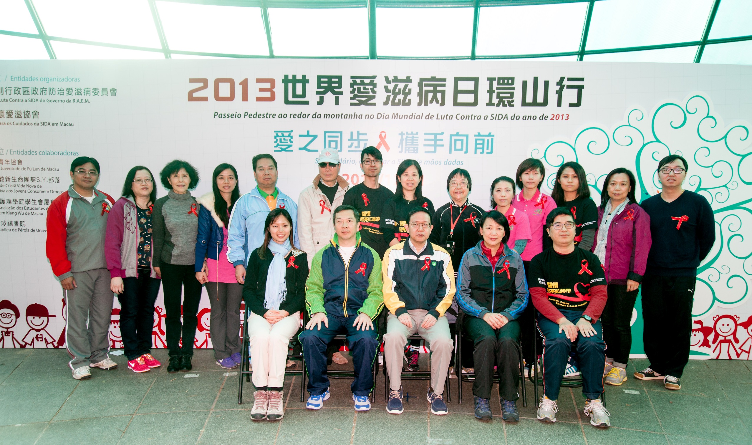 今天(12月1日)是世界愛滋病日,澳門特別行政區政府防治愛滋病委員會聯同澳門關懷愛滋協會,以「愛之同步․攜手向前」為題,在松山緩跑徑舉行「2013年世界愛滋病日環山行」活動。出席的主禮嘉賓包括:衛生局疾病預防控制中心林松主任、社會工作局預防藥物濫用處許華寶處長、教育暨青年局成人教育中心張貴新主任、澳門關懷愛滋協會鄭思樂理事長和香港衛生署衛生防護中心(特別預防計劃)舒寶兒醫生。
