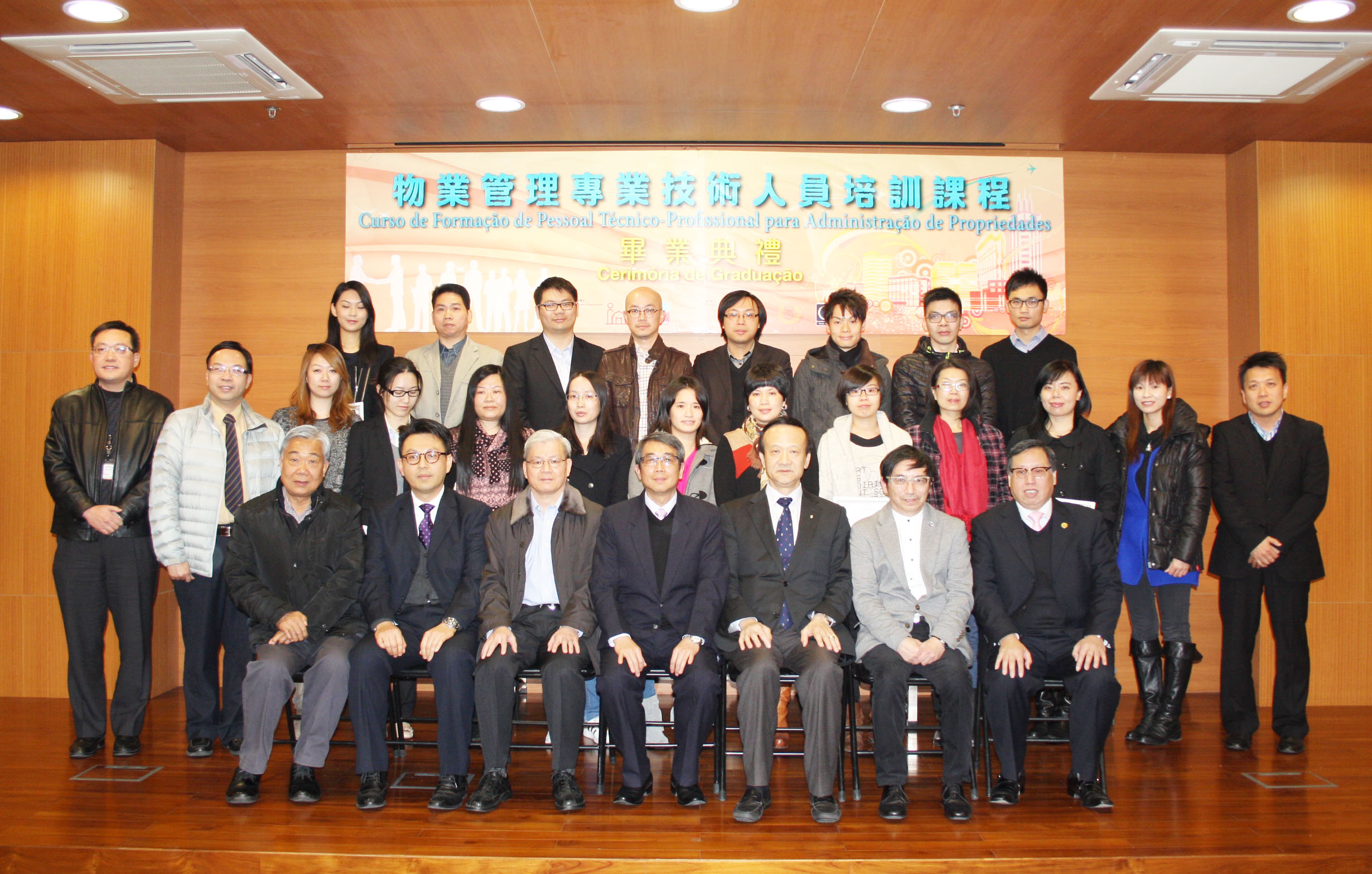 由房屋局及勞工事務局主辦,澳門物業管理業商會、英國特許房屋經理學會(亞太分會),以及香港職業訓練局協辦的第八期「物業管理專業技術人員培訓課程」於12月26日假房屋局舉行畢業典禮。今期培訓課程共有37名學員成功通過課程專業考核,且出席率超過80%,可取得由房屋局和勞工事務局聯合簽發之課程證書,以及由香港職業訓練局香港專業教育學院(摩理臣山)簽發之證書。