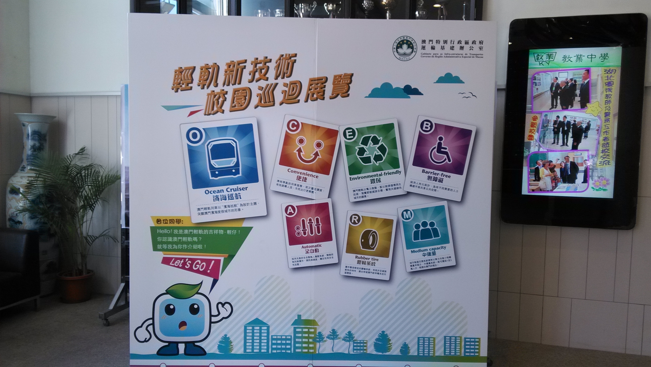 另外,《輕軌新技術校園巡迴展覽》亦已於10月開始在本澳各中學巡迴展出,展覽內容以初中學生為主要對象,以字母卡的形式向學生介紹澳門輕軌「便捷、環保、無障礙」的特性,令學生輕易掌握輕軌的建設理念和科學技術。校園巡迴展覽於每間學校展出兩星期,至目前已走訪10間中學,在2014年展覽將繼續為學生帶來更多澳門輕軌新資訊。