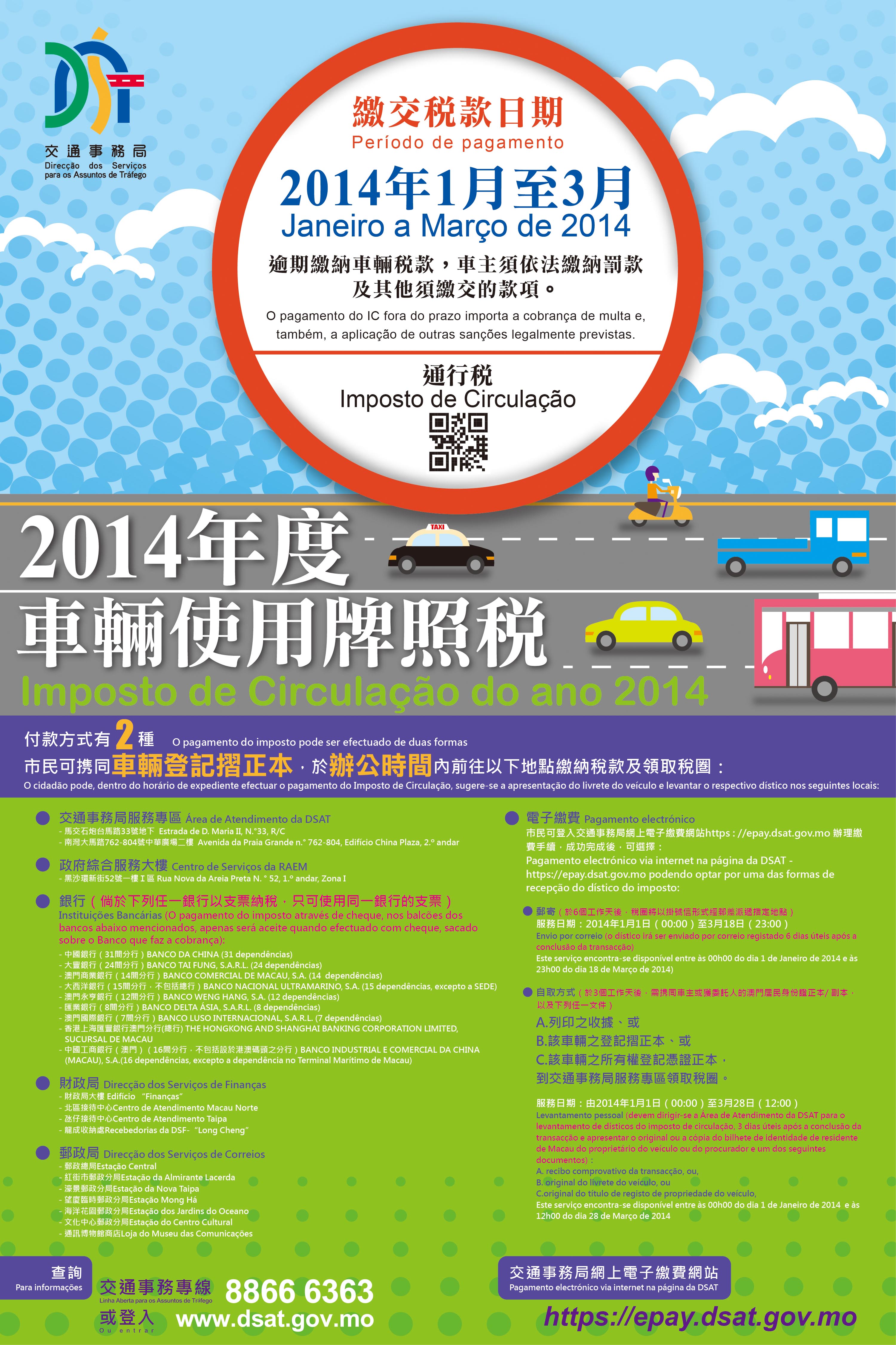 2014年度車輛使用牌照稅(即俗稱行車稅)徵收工作由即日(1月1日)起展開,至3月31日結束。市民可前往交通事務局服務專區、財政局大樓及接待中心、郵政總局及部份分局、本澳9間銀行120多間總行及分行繳交;亦可登入交通事務局網上電子繳費網站https://epay.dsat.gov.mo辦理繳費手續。逾期繳納行車稅將被徵收過期罰款。