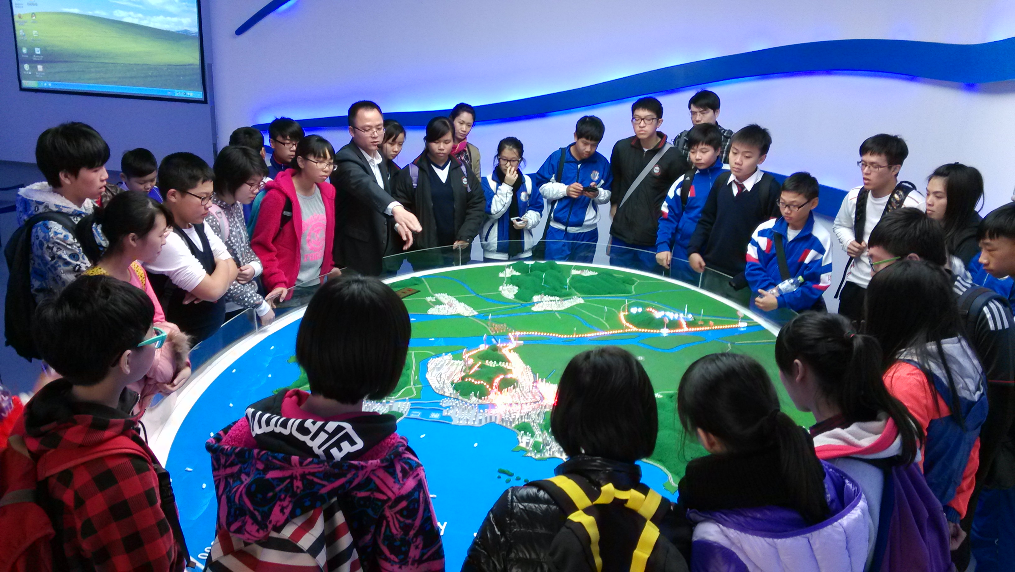 講解員向學生介紹竹銀水源工程對本澳供水安全的重要性。竹銀水源工程於2011年4月竣工,為珠海和澳門兩地的供水系統增加約4,000萬立方米的調節庫容,對於珠澳兩地在應對鹹潮、改善供水水質、處理突發水污染事件等多方面發揮著重要作用,珠澳未來十年的供水安全已可得到保障。竹銀水源工程竣工並投入運作後,本澳日常的自來水鹹度一直穩定地保持在低鹹度的優質水平。