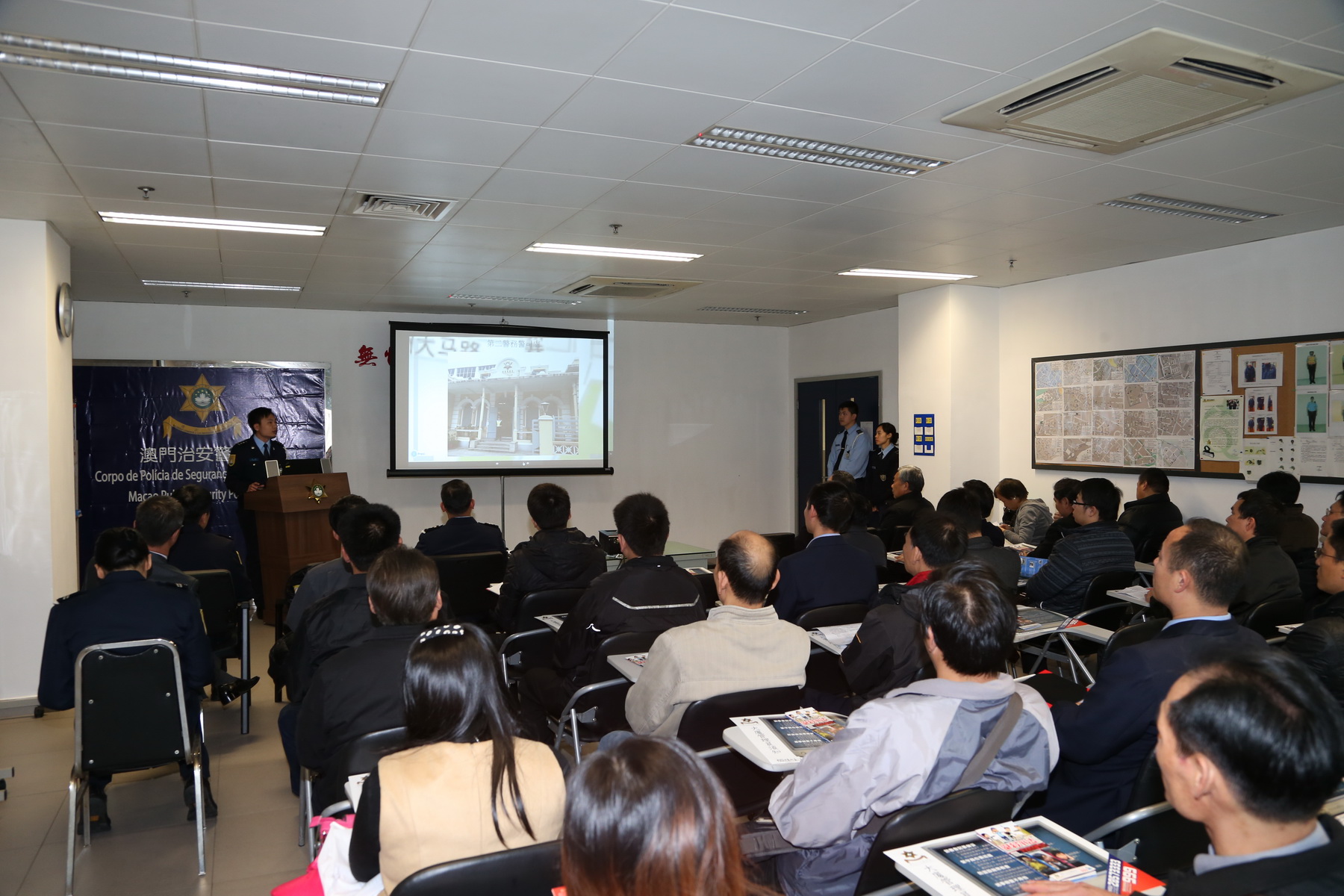 參與工作坊的是來自物業管理業商會轄下的管理公司主任約四十名物業管理主任,物業管理專業人員協會會長周爵、物業管理業商會理事長崔銘文、副會長楊永泰、崔紹文等出席活動。活動由座談簡報開始,數名警官先後介紹澳門警務廳的架構職能、警區的日常運作、以及社區警務等;分析冬防期間的治安形勢,注意盜、騙案件,提醒物業管理者加強防範的要領;主講者特別分享了在以往辦案的經驗,透過物業管理公司及從業員提供的材料,從而快速破案,在案例中反映出警民合作的重要性。隨後多名物管從業員就警方執法、物管人員遇事處理等坦誠交流,主講者認真聽取寶貴意見並即場回應,嘗試從各個方向分析事件,曉之法理,以加強業界對警務工作的認知。