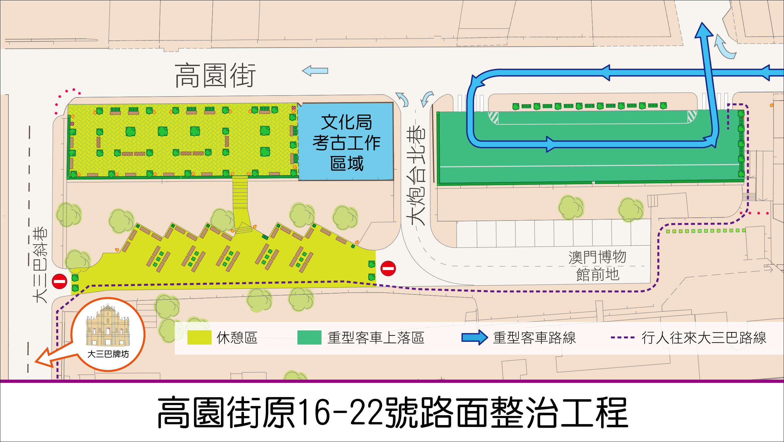 至於原16號及18號位置則為大型客車上落客區,車輛從高園街經大炮台北巷進入,落客或接客後由同安街離開,避免了駛往大三巴牌坊及耶穌會前地造成人車爭路的局面。設計上考慮到人車分隔,旅客也不用步出高園街,而是經博物館前地、進入休憩區上區,再抵達牌坊,可起疏導作用,減輕高園街路面壓力。