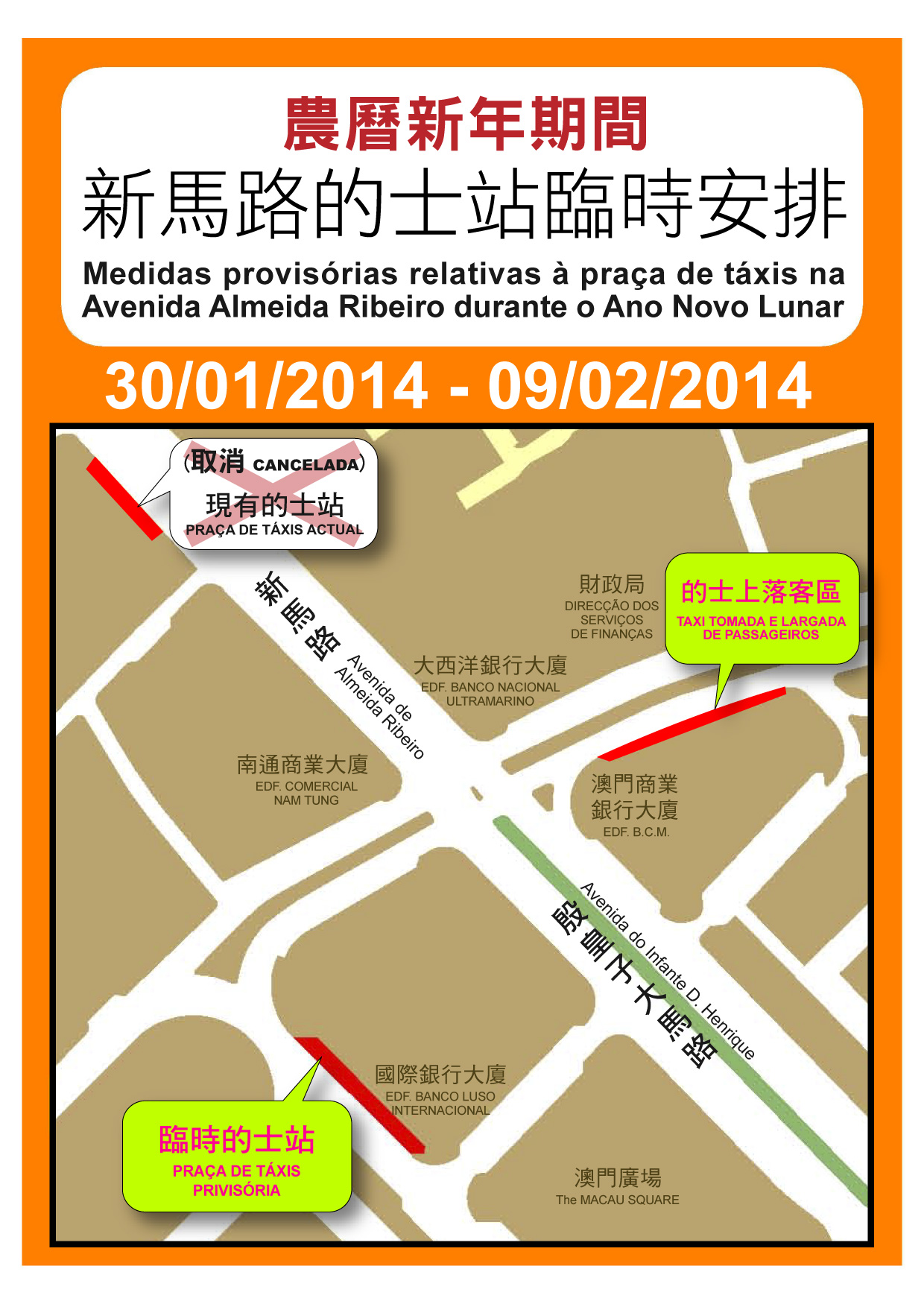 由年三十(1月30日)上午9時起,至年初十(2月9日)期間暫停使用新馬路的士站,需要乘坐的士的乘客可使用位於南灣大馬路近商業銀行一側的士上落客區,以及設於蘇亞利斯博士大馬路近國際銀行大廈之臨時的士站上落。局方將於相關路段設置指示牌及安排交通輔導員引導乘客前往的士站乘車和維持秩序。