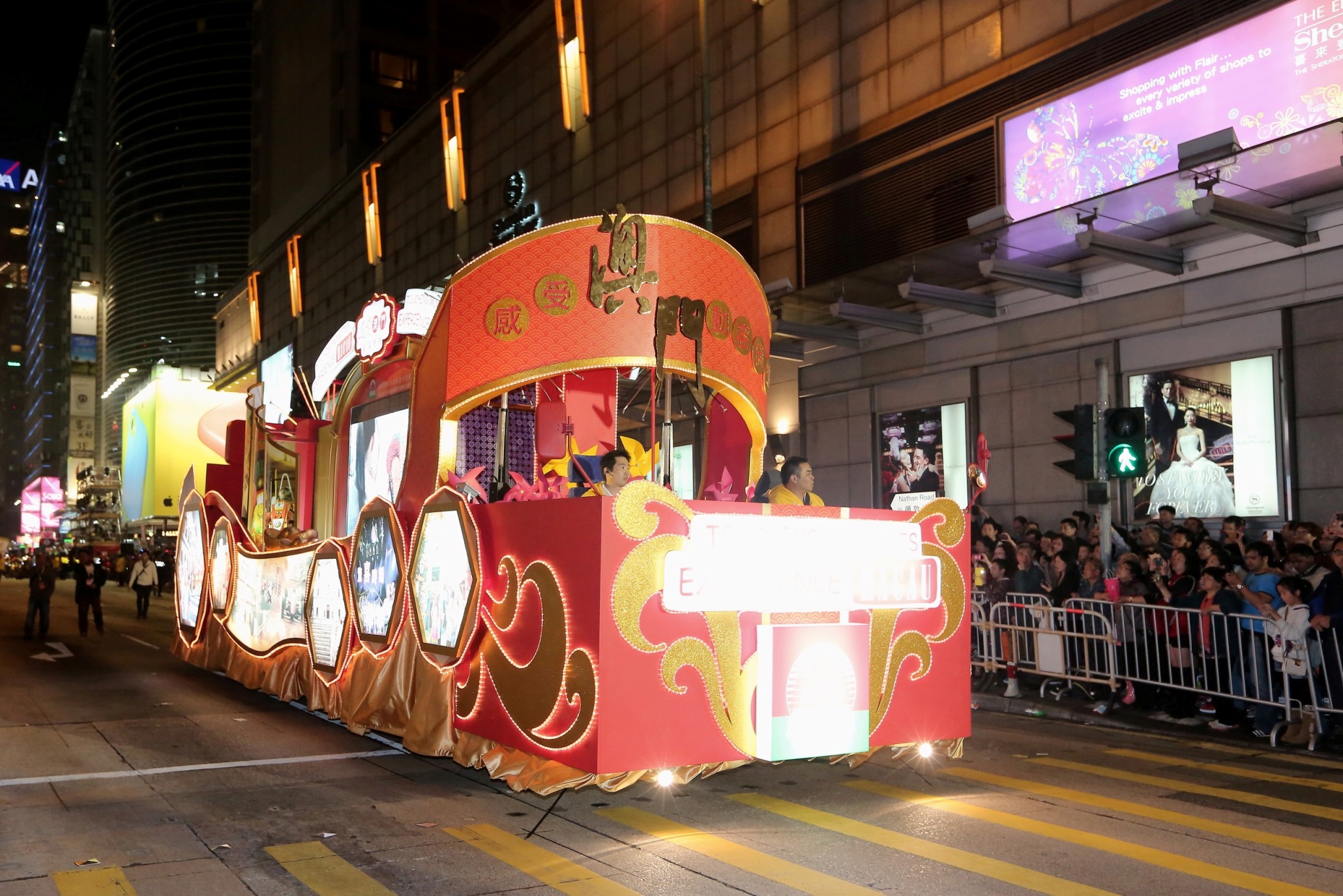 旅遊局花車今年繼續以「感受澳門 動容時刻」作主題,用「鼓」作為整個花車結構的亮點,並有LED 電視屏,播放各個動容時刻的精彩片段,展示澳門作為一個多元豐富的旅遊勝地。車上的顯示屏展示不同節日盛事的圖片,象徵澳門中西文化交融,是一個充滿活力及多元化的旅遊城市。車的兩側有多個澳門特色圖片的燈箱,讓香港市民及旅客感受澳門各種「驚喜」、「綺麗」、「心醉」、「品味」與「喜躍」的動容時刻。而車身顏色以金色為主,希望帶出農曆新年的喜悅與豐足。