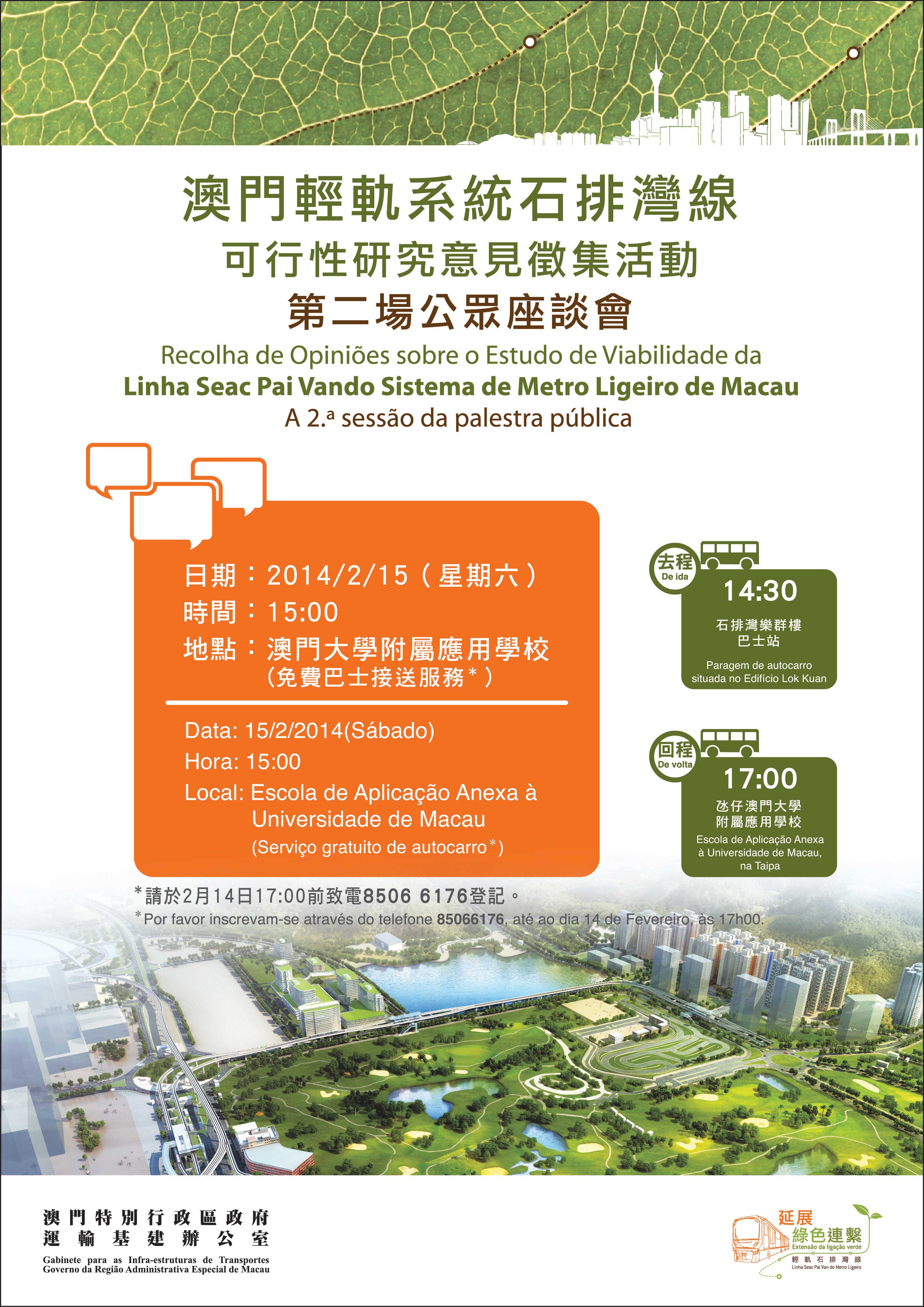 運輸基建辦公室於1月10日至2月23日期間展開「澳門輕軌系統石排灣線可行性研究意見徵集活動」,以了解社會對輕軌項目延伸至石排灣的意見和想法。為更廣泛吸引市民參與,尤其鼓勵石排灣公屋居民發表意見,運建辦將於本週六(15日)下午三時假澳門大學附屬應用學校一樓演講廳舉行第二場公眾座談會,屆時將向與會人士介紹規劃輕軌石排灣線的考慮,還會透過動畫短片介紹各個概念方案,歡迎市民踴躍出席共同討論。
