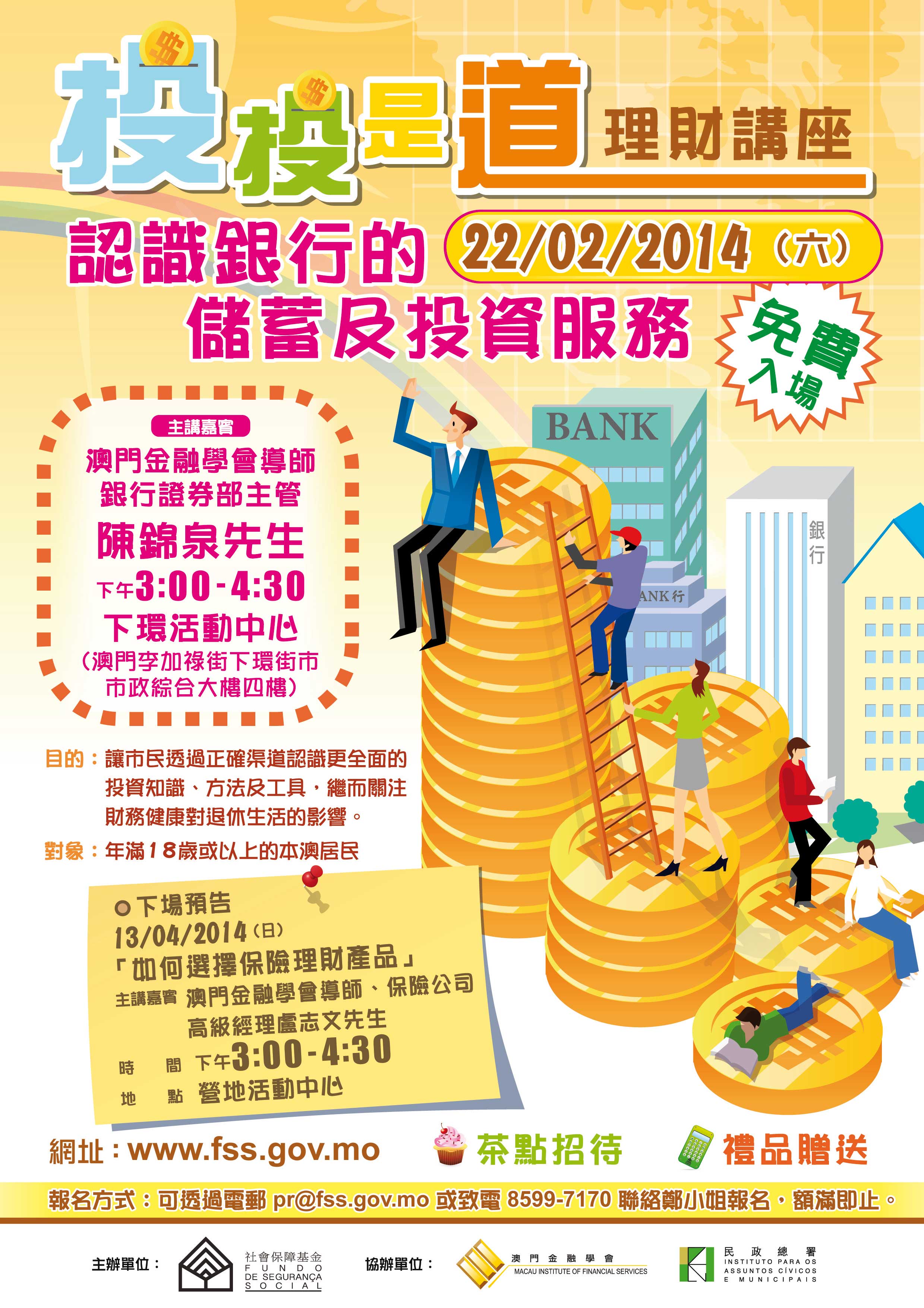 “投投是道”系列講座由社保基金主辦,民政總署及澳門金融學會協辦,目的是鼓勵市民學習基本的投資知識、方法及工具,並關注財務健康對退休生活的影響。有興趣的人士可於辦公時間致電85997170報名,或郵寄姓名、出席人數和聯絡電話至pr@fss.gov.mo。活動名額有限,額滿即止,詳情可瀏覽社保基金網頁www.fss.gov.mo。