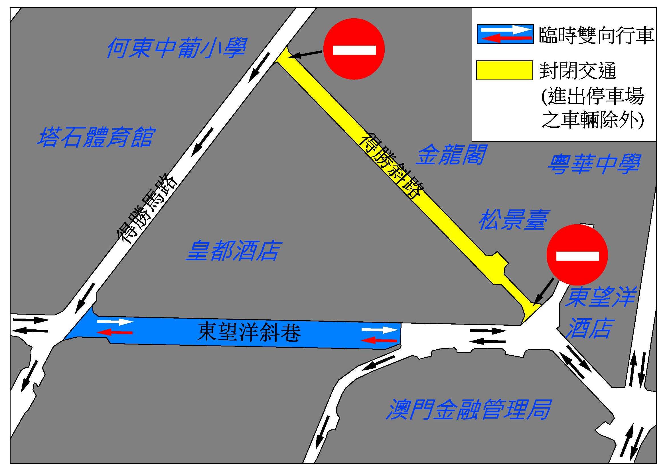 因新建大廈接駁街渠,介乎東望洋斜巷與得勝馬路之間的一段得勝斜路,周四(20日)上午11時實施封閉交通,除進出停車場之車輛外,禁止車輛駛入。期間,介乎得勝斜路至得勝馬路之間的一段東望洋斜巷臨時改作雙向行車,“得勝斜巷”巴士站亦會暫停使用,臨時巴士站將設於東望洋斜巷近澳門金融管理局,方便乘坐6A、28C及H1路線的乘客上落。配合施工安排,現場的咪錶泊車位及電單車泊車位將暫停使用,工期約10日。
