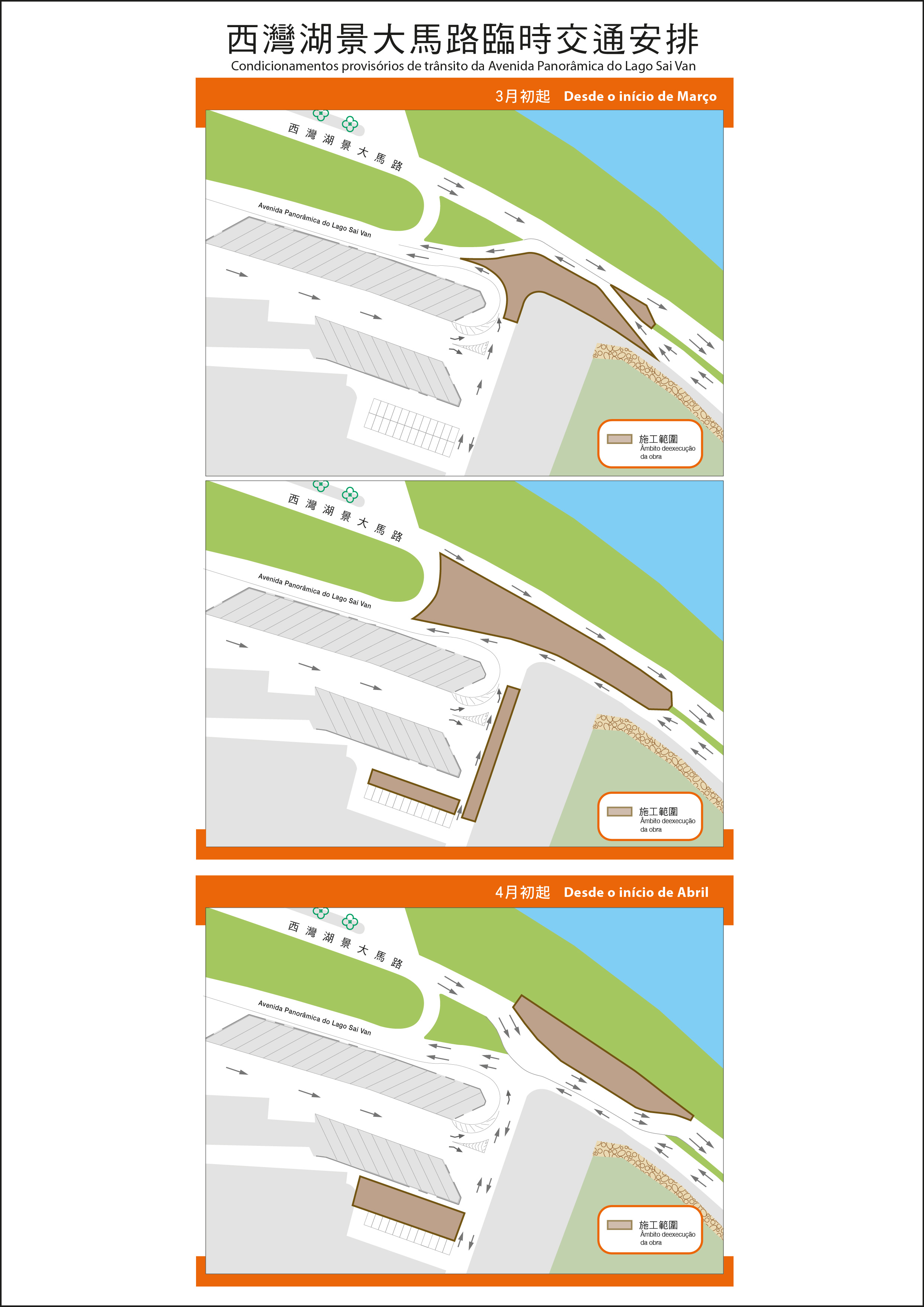 為配合施工需要,由3月初起,施工單位將分階段調整西灣湖景大馬路近媽閣巴士總站一帶的臨時圍封範圍,往河邊新街及西灣大橋方向的行車道繼續維持現時雙向單線行車;並會爭取於3月底至4月初,恢復往河邊新街方向的雙線行車,往西灣大橋方向則維持單線行車。另一方面,西灣湖景大馬路臨時停車場的部份私家車位會由3月11日起暫停使用。施工單位預計工程將於4月中下旬完成,並全面恢復西灣湖景大馬路原來的雙向雙線行車以及臨時停車場的車位使用,以盡量減低施工對交通的影響。