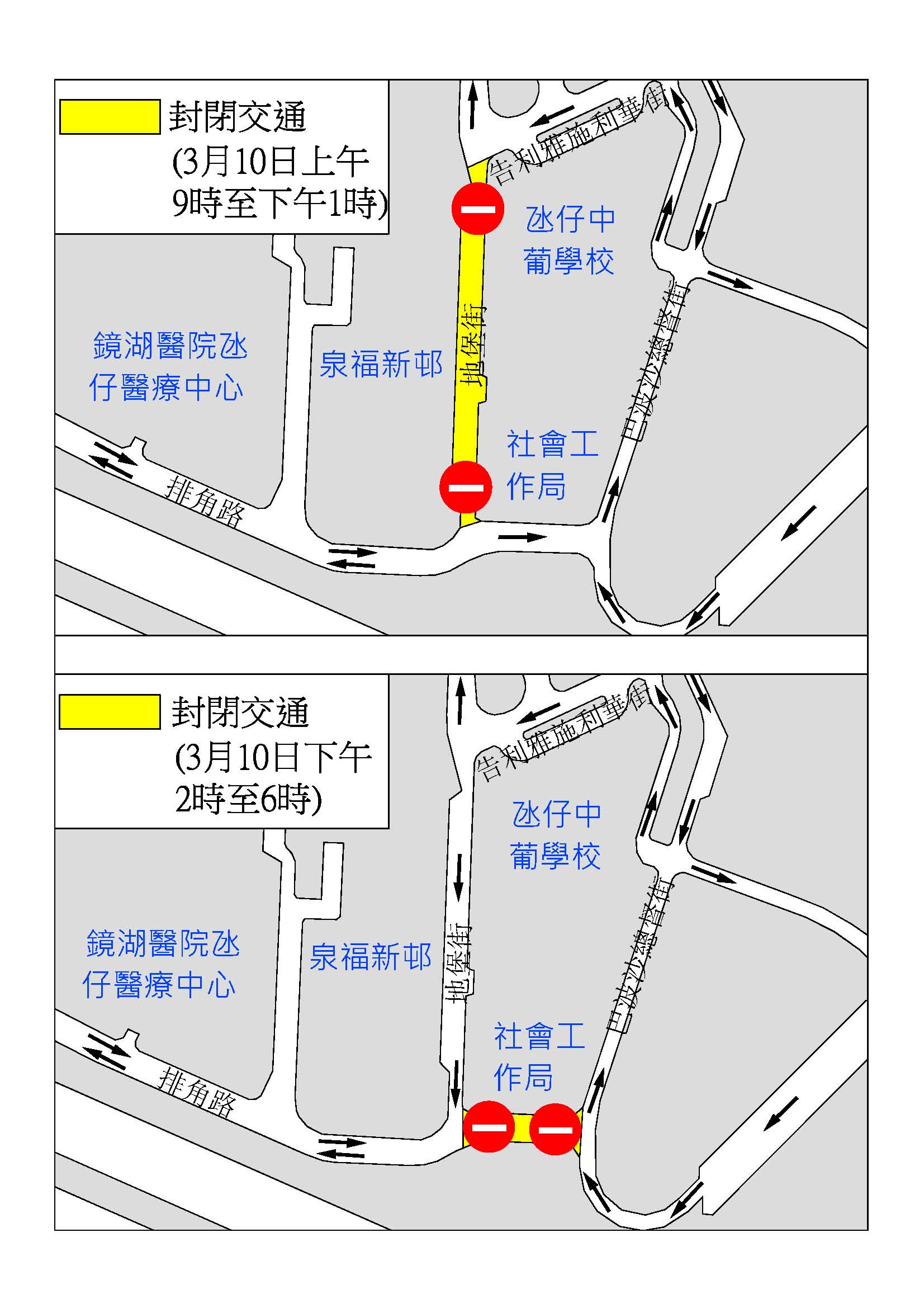 雨季將至,為保障公眾安全,土地工務運輸局開展大廈外牆檢測工作,以便需要時作出相關跟進處理。配合檢測工作,周一(10日)上午9時至下午1時,介乎告利雅施利華街與排角路之間的一段氹仔地堡街實施封閉交通;下午2時至6時,介乎地堡街與巴波沙總督街之間的一段氹仔排角路則會實施封閉交通,期間禁止車輛駛入。