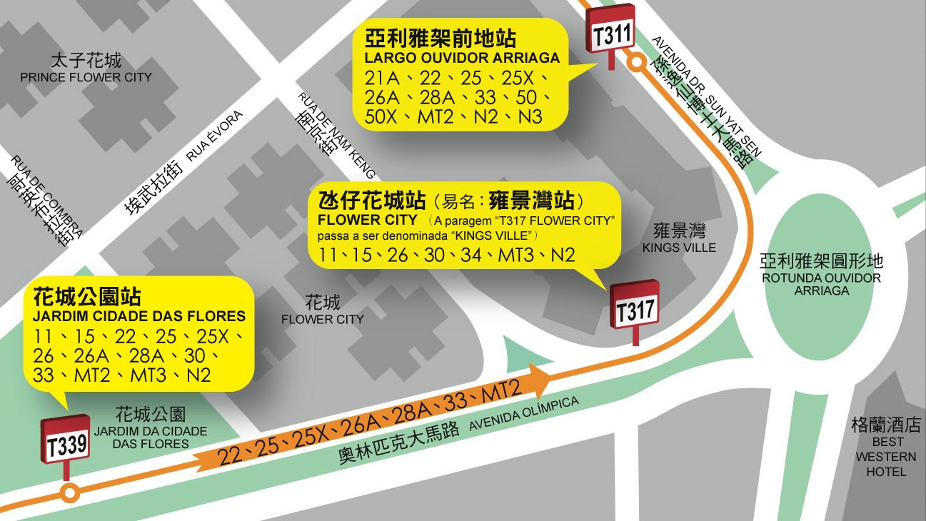 “氹仔花城”站和“花城公園”站兩巴士站距離不足120米,卻有14條巴士路線停靠,為氹仔亞利雅架圓形地及周邊道路構成一定壓力。為紓緩現場的交通狀況,提高巴士的效益,交通事務局將於周六(15日)首班車起,分流停靠“氹仔花城”站的巴士路線,22、25、25X、26A、28A、33及MT2共7條巴士路線在停靠“花城公園”站後,取消停靠“氹仔花城”站,直接停靠“亞利雅架前地”站。為清晰現場的候車位置,“氹仔花城”站會易名為“雍景灣”站。