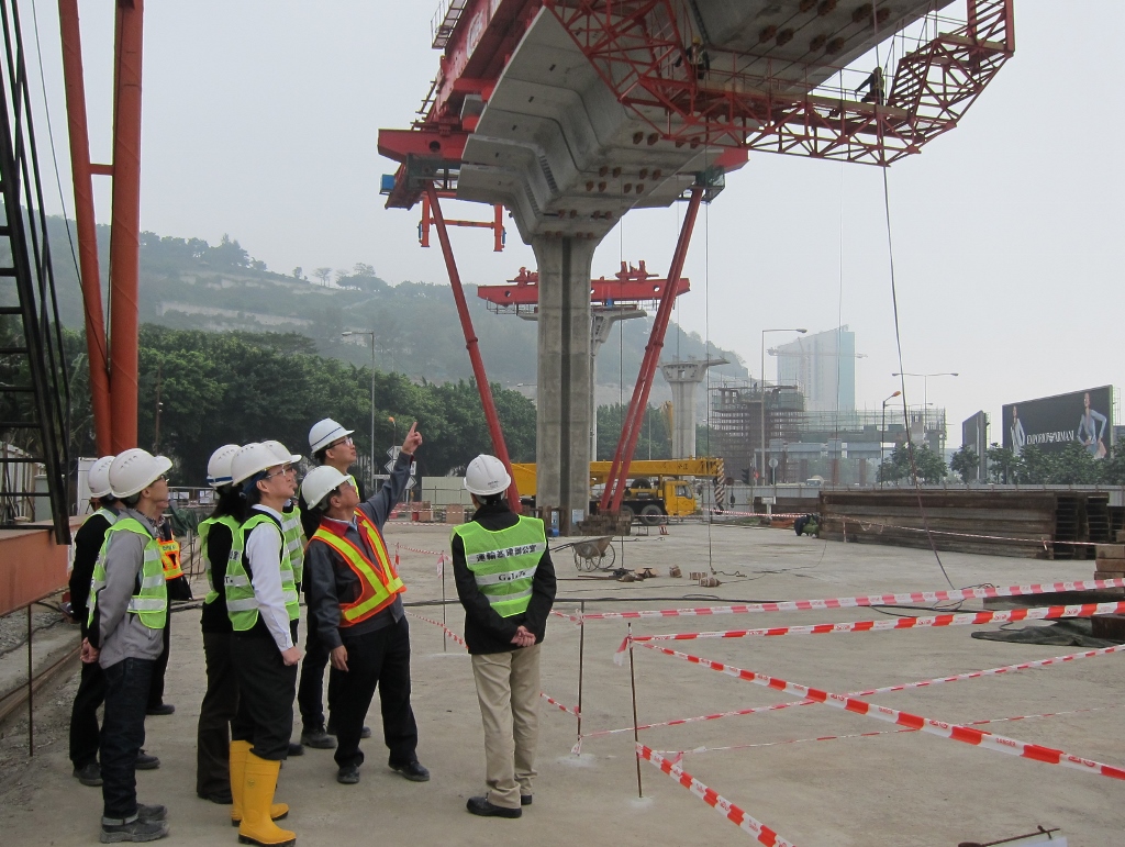 而首次應用於本澳的架橋機主要由吊運天車、主樑及輔助樑組合而成,全長約70米,可以同時負載超過450噸、相當於300多部一般輕型汽車的重量。而為了加緊建設的進程,施工單位稍後亦將於霍英東博士大馬路增設另一台架橋機,同步進行吊裝工作。運建辦並會繼續密切注意施工安排,以安全施工及減低對公眾的影響為目標,不斷完善輕軌的建設工作。參與是次活動的人員包括運輸基建辦公室副主任李安德、職務主管黃紹良、高級技術員何家豪等。