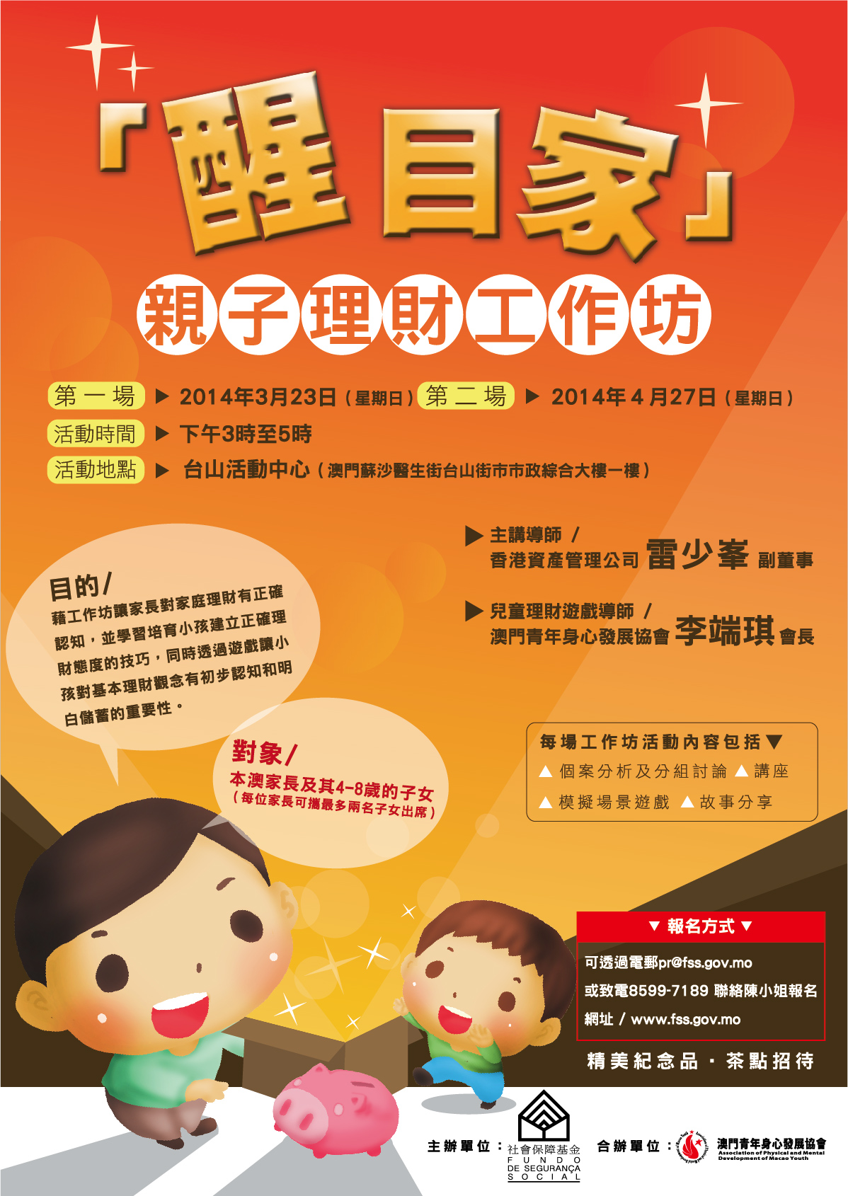 「醒目家」親子理財工作坊由社保基金及澳門青年身心發展協會合辦,目的是讓家長對家庭理財有正確認知,並學習培育小孩建立正確理財態度的技巧,同時透過遊戲讓小孩對基本理財觀念有初步認知和明白儲蓄的重要性。有興趣的人士可於辦公時間致電85997189報名,或郵寄姓名、出席人數和聯絡電話至pr@fss.gov.mo。活動名額有限,額滿即止,詳情可瀏覽社保基金網頁www.fss.gov.mo。