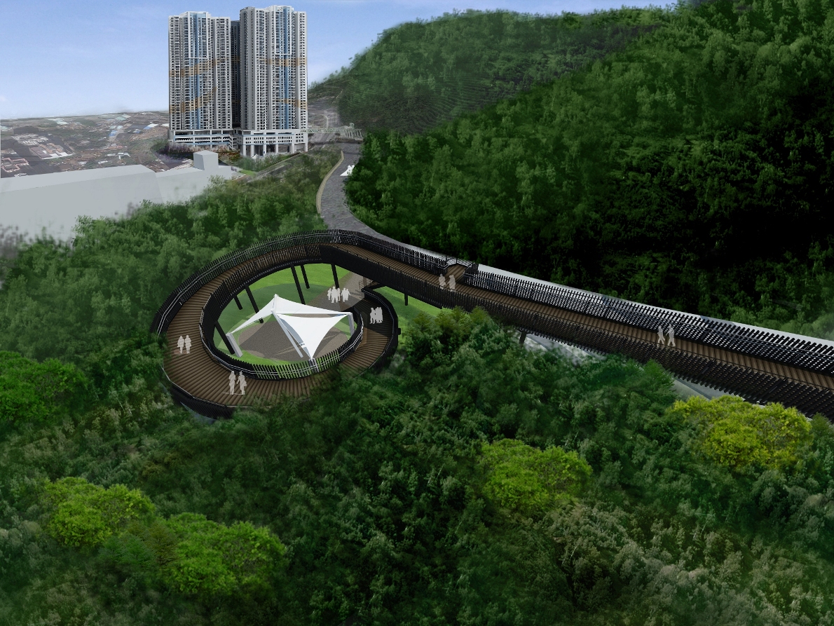 步行徑工程主要分為兩部份,第一部份由湖畔大廈行人天橋至大潭山瞭望台,建造全長約400米的沿山行人步道及周邊斜坡整治;第二部份主要建造斜行升降機及行人天橋。