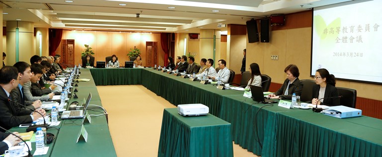 非高等教育委員會於3月24日在教育暨青年局一樓仲尼堂舉行了2014年第一次全體會議,由委員會副主席、教育暨青年局局長梁勵主持。會議介紹了《私立學校通則》草案第二階段的諮詢文本、《正規教育課程框架》建議實施日程安排、2014/2015學年各項津貼調整建議以及家長教育工作。